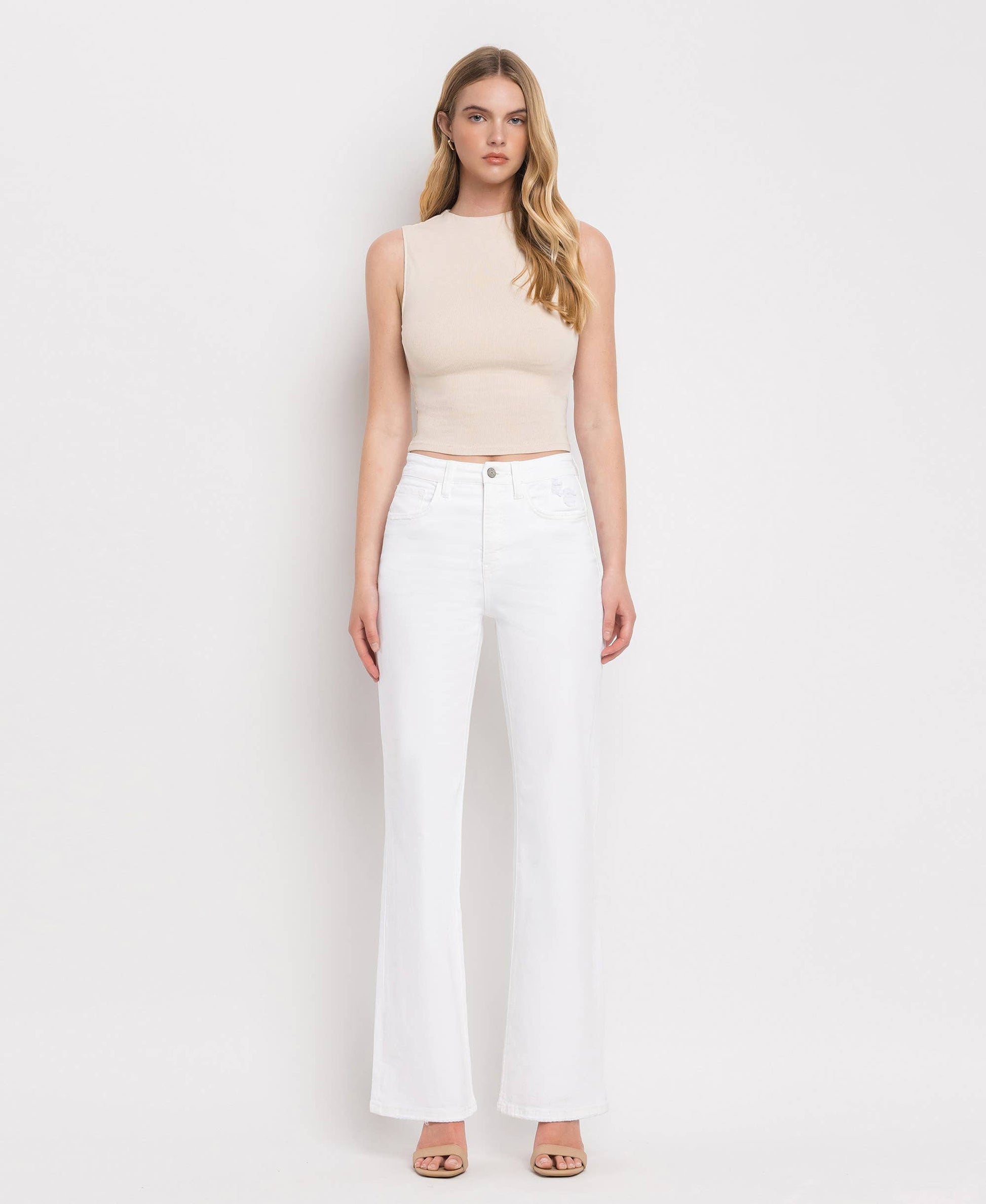 COMFORT STRETCH DENIM, SUPER HIGH RISE WAIST, 90'S VINTAGE STYLE, SLIGHTLY DISTRESSED DETAIL, FULL LENGTH, FLARE JEANS