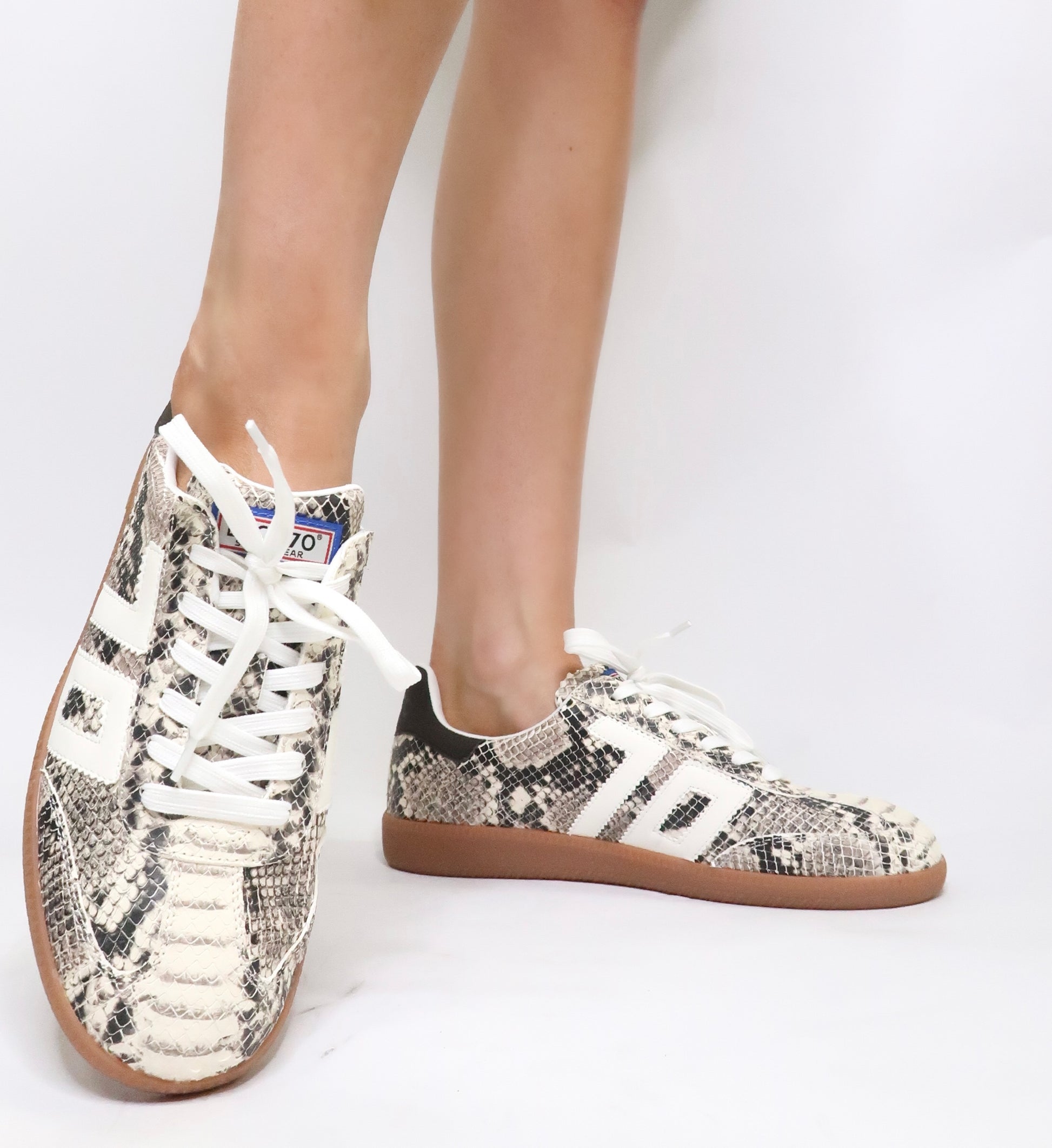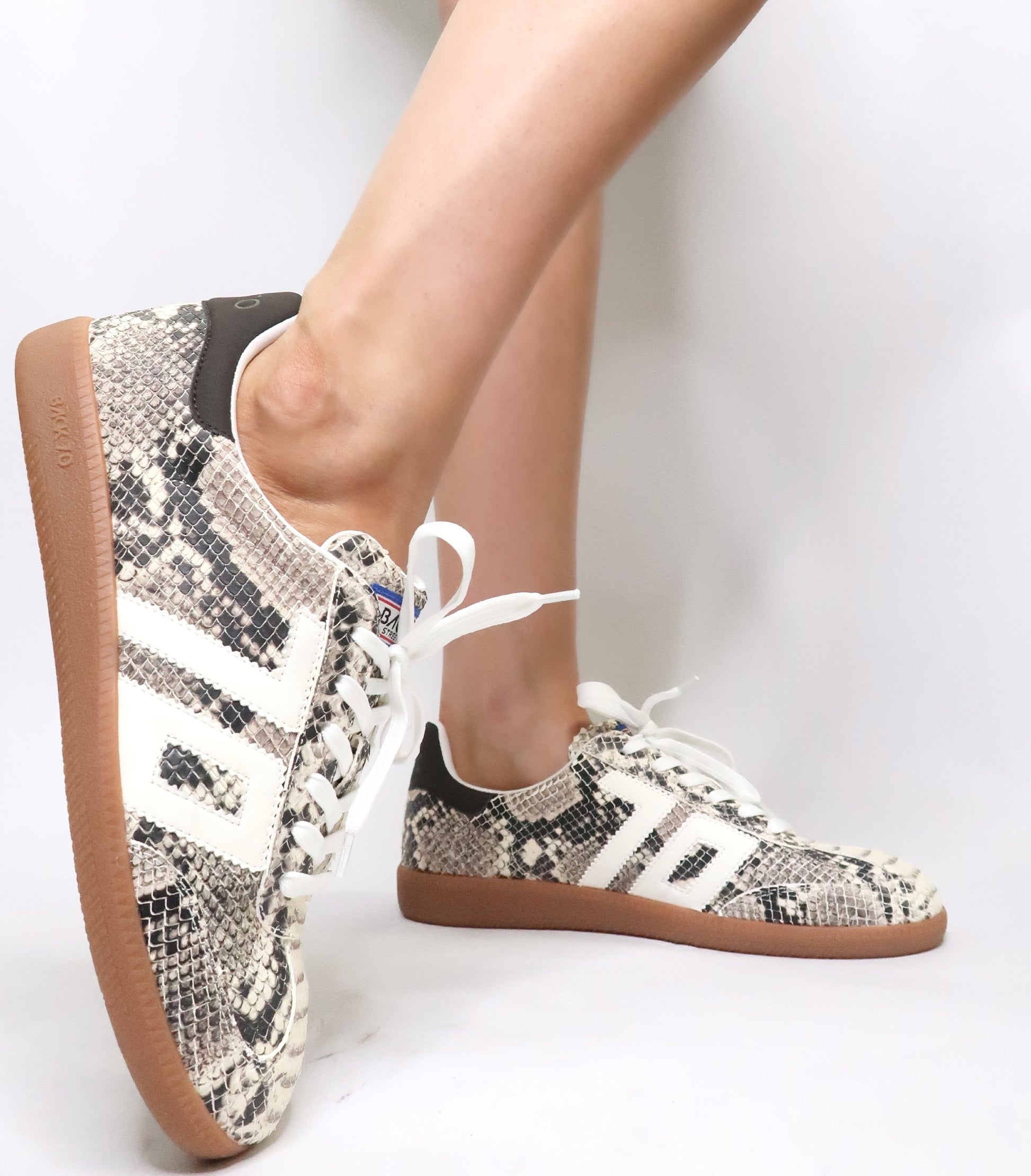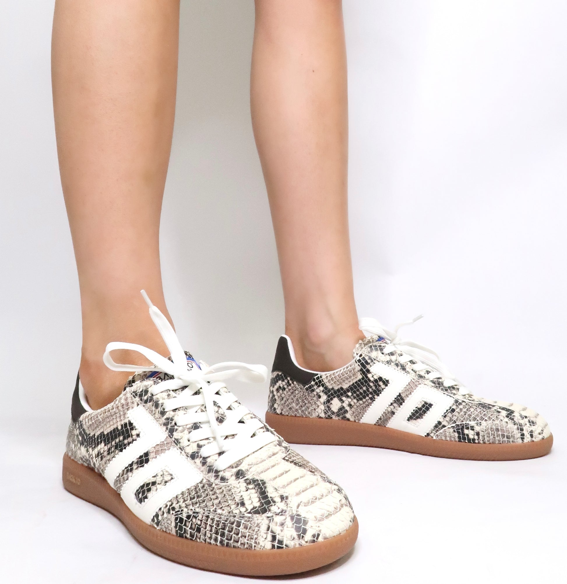 The Cloud SR is your not-so-basic snakeskin sneaker¿sporty, striking, and straight from the style playbook of vintage Italian cool. Crafted from genuine leather with a bold snake print and finished with a gum rubber sole, it channels retro soccer vibes with a fashion-forward twist. The iconic Back 70 emblem adds heritage flair, while the tonal print keeps things effortlessly elevated. A go-to pick for women searching for snakeskin sneakers with attitude and boutique-worthy appeal.