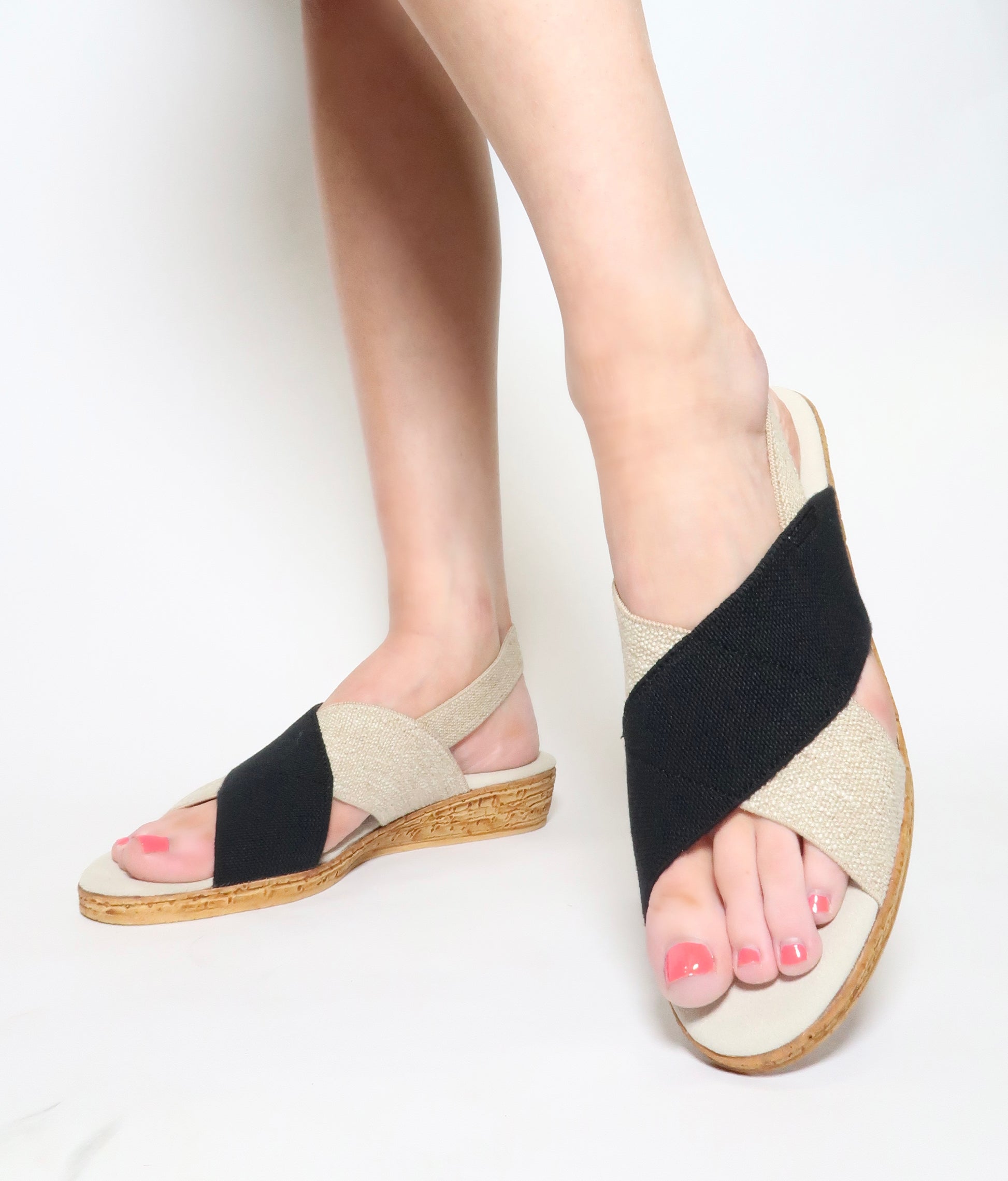 - Stretch upper, crisscross straps, sling back, cork-like bottom