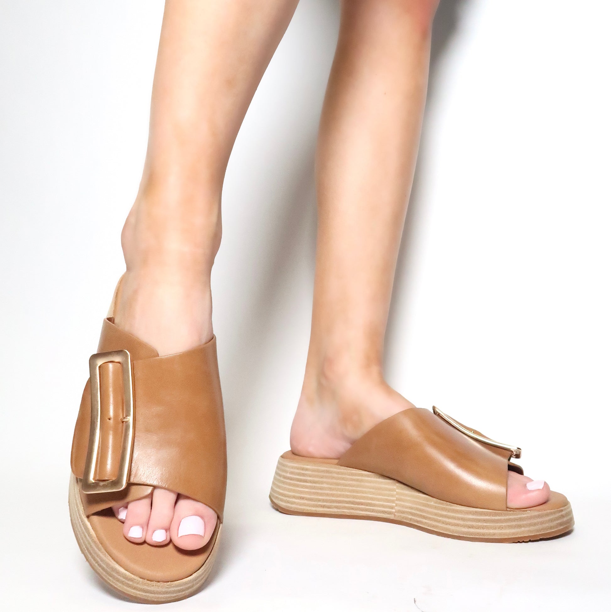 This leather upper wedge slide sandal comes with an elegant buckle and boasts a heel height of 1 7/8" and a platform height of 7/8". With its leather lining and padded footbed, comfort and style are at your feet.