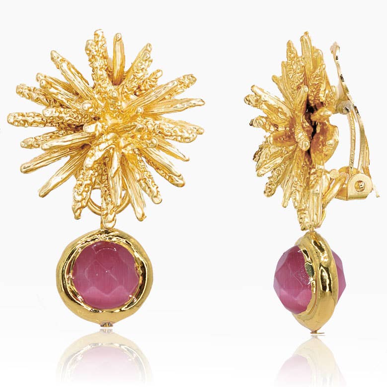 Playful faceted colored beads dangle from our signature starburst clip ons to create these beautiful statement making earrings.