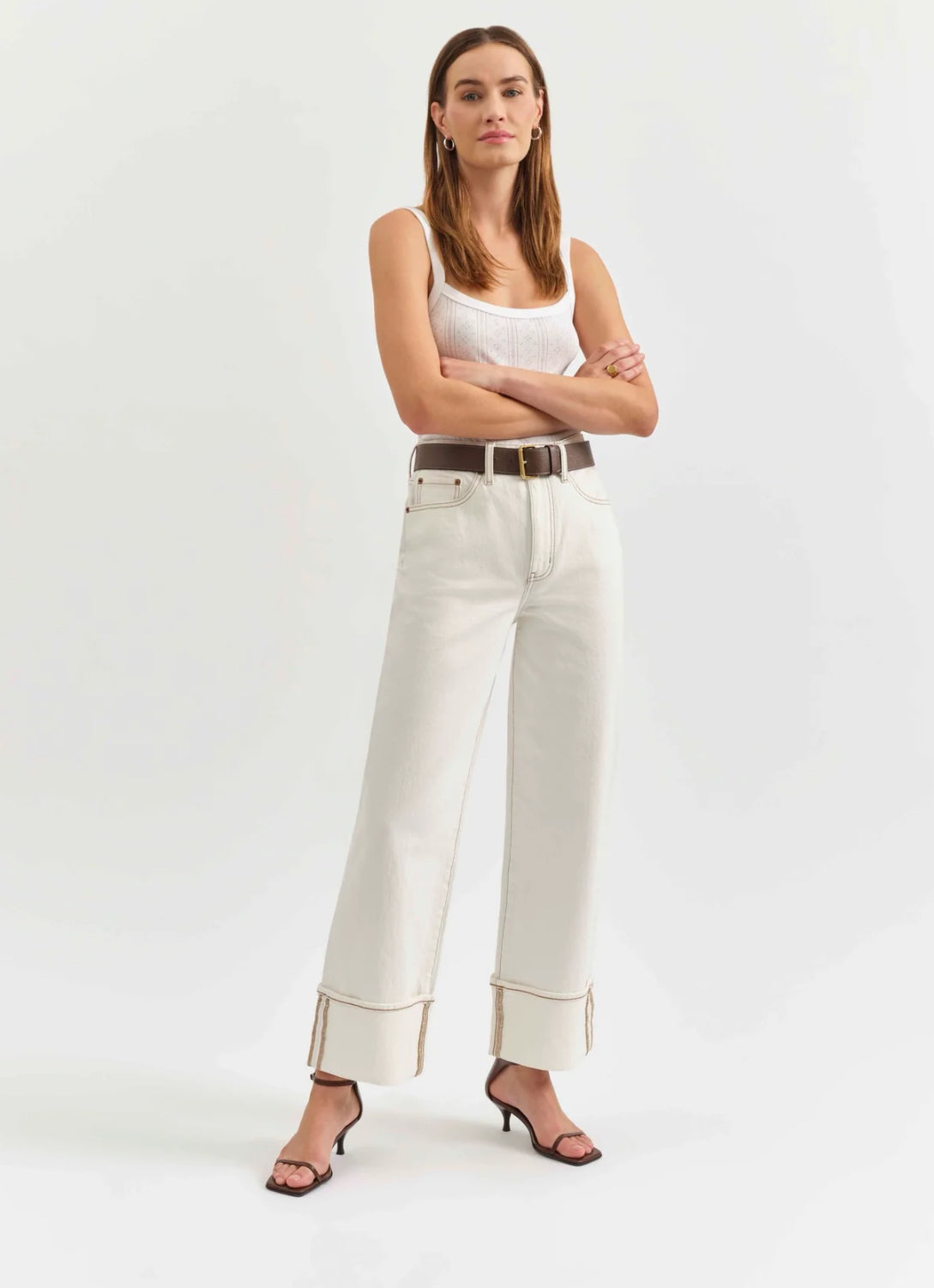Undone, but still put together. Our relaxed fit cuffed denim is a straight that is constructed in a cream wash. Crafted from our Just Right denim, with the perfect mix of rigid and stretch.