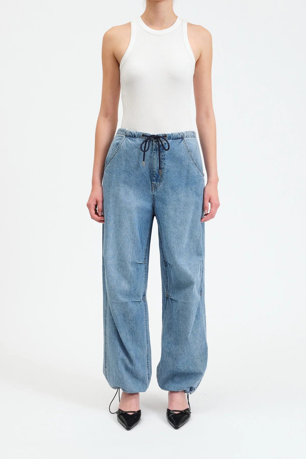 Introducing the most relaxed jean we've ever launched. This oversized jogger is made from a light cotton fabric, with a leg that can be cinched in at the ankle for a more shaped look. The drawstring high rise is made for a cool sense of comfort, that also acts as a fashion moment.