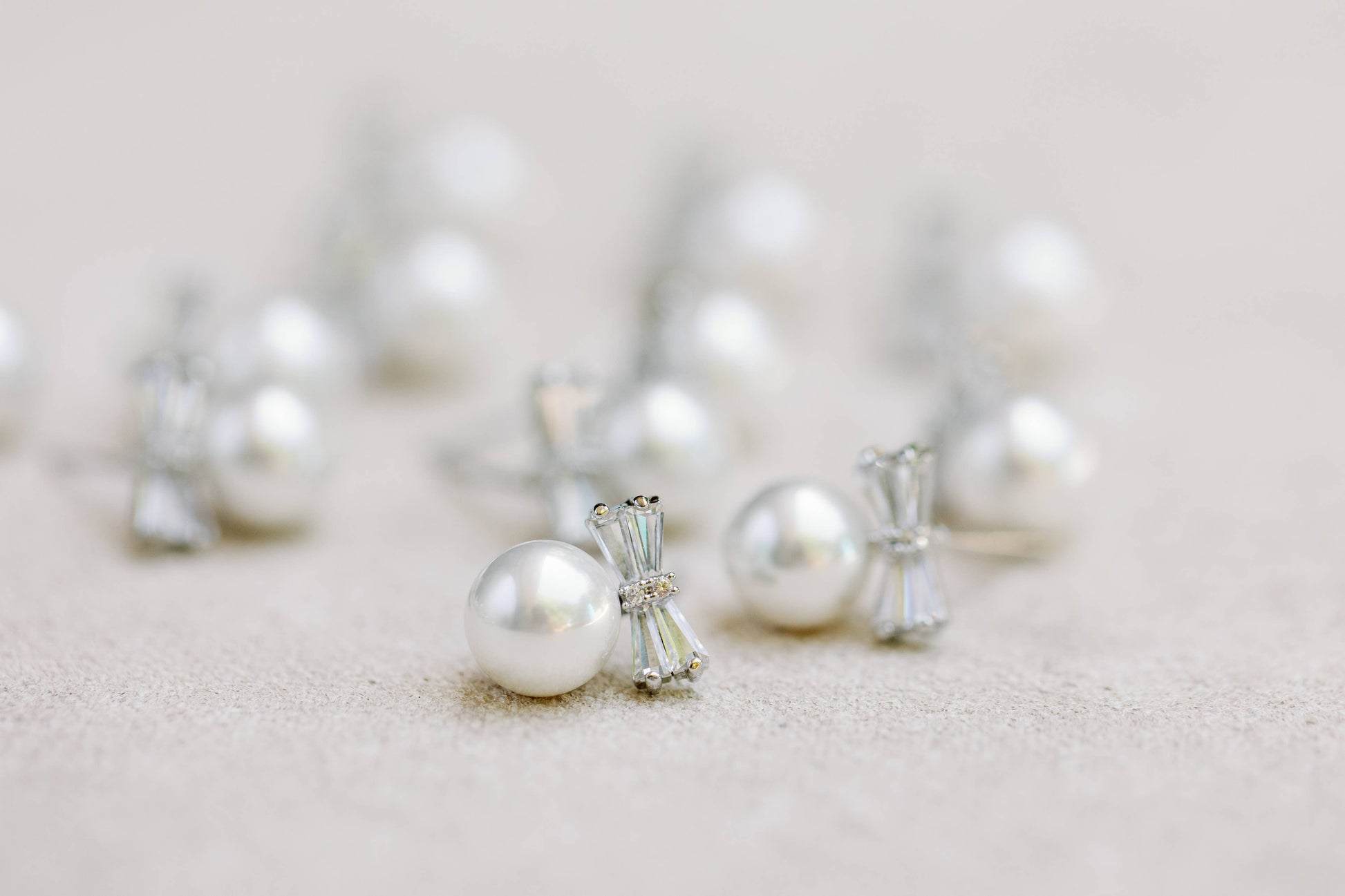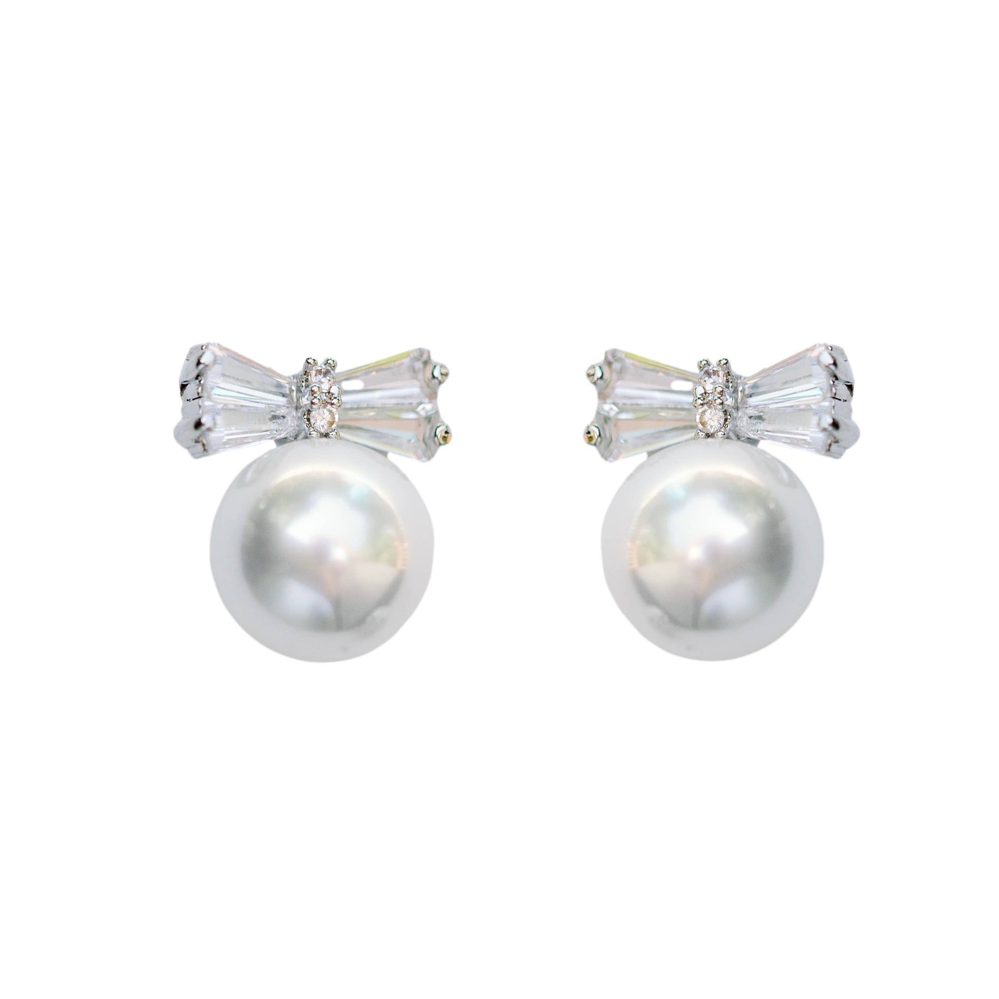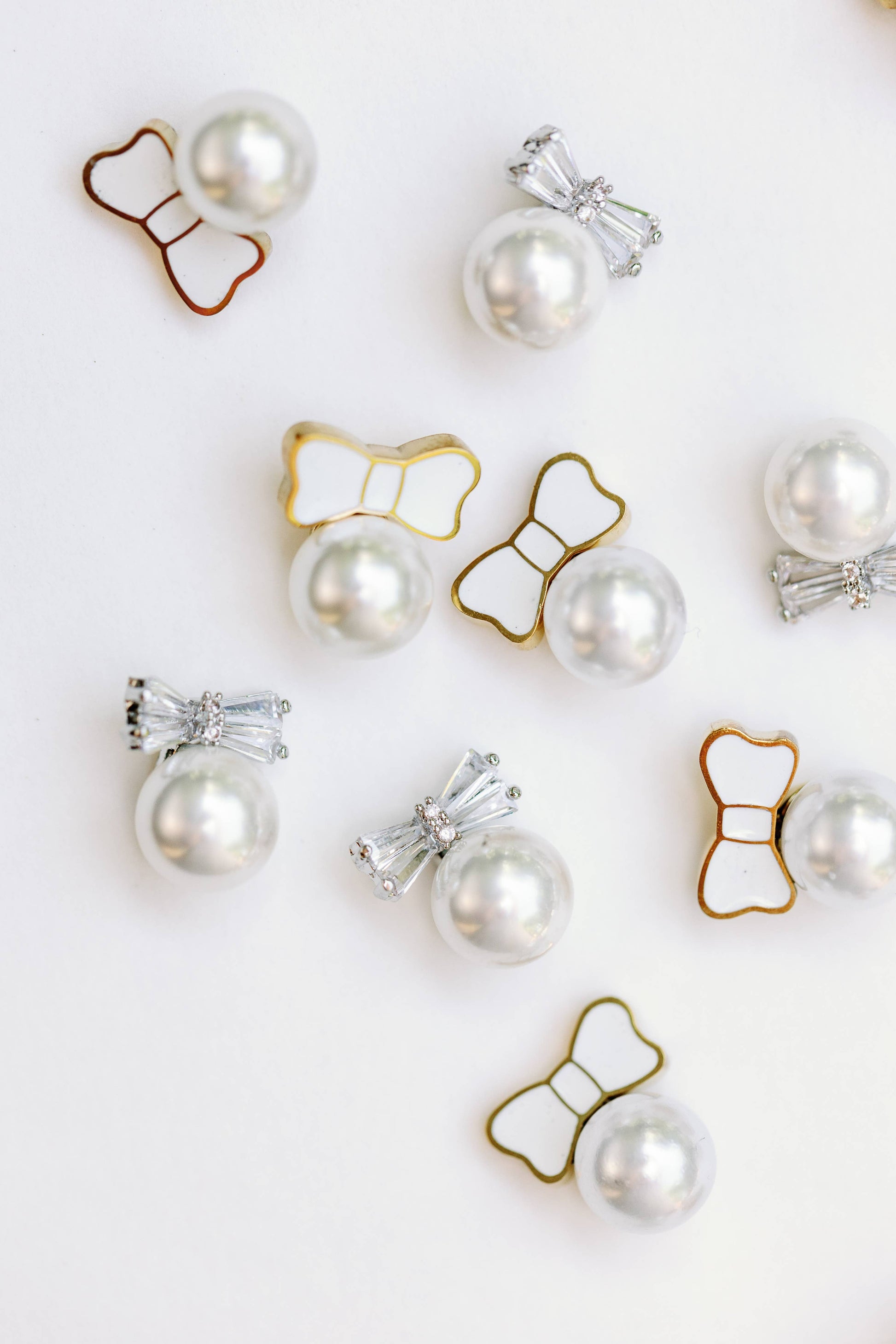 Add a playful touch to your look with our newest diamond bow pearl earrings! These mini studs feature a lustrous mini 8mm faux pearl topped with a elegant faux diamond bow. These make a perfect ‘grab and go’ gift for the holidays!
