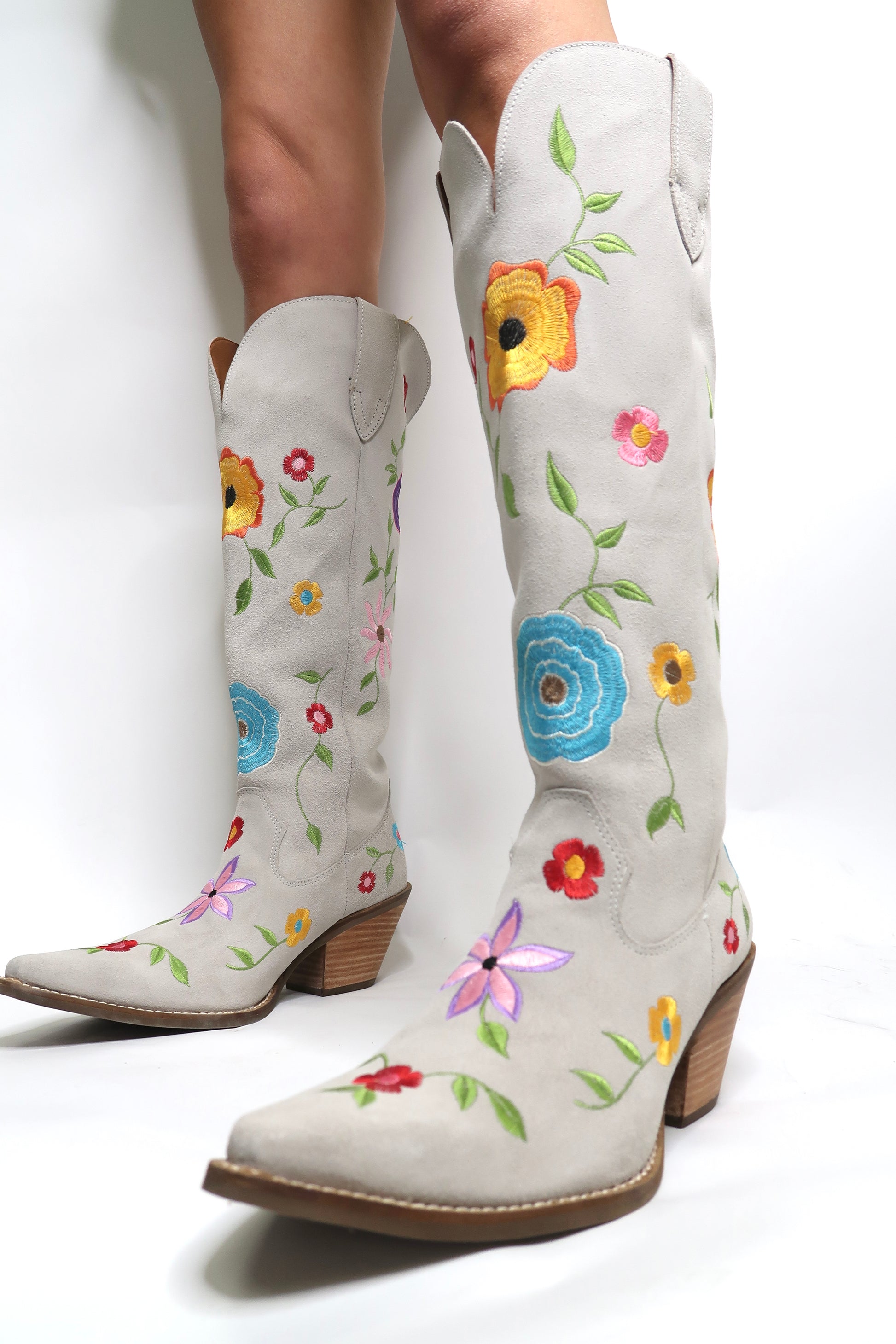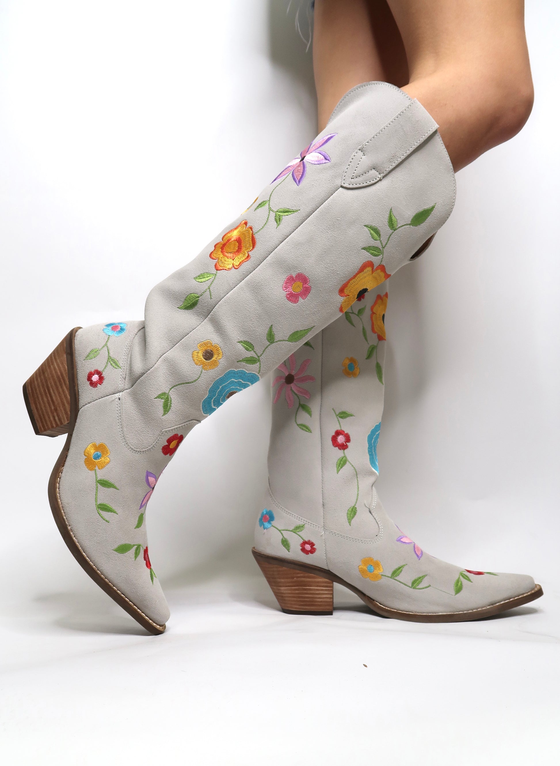 Make a statement wearing the Flower Power Suede Boot from Dingo1969. These boots embody retro charm with a touch of peace and love. Featuring a snip toe, a 2 ½ inch tall fashion heel, and a cushioned comfort insole, they stand 18 inches tall. Suit every personality, the whimsical design is enhanced with beautiful floral embroidery.