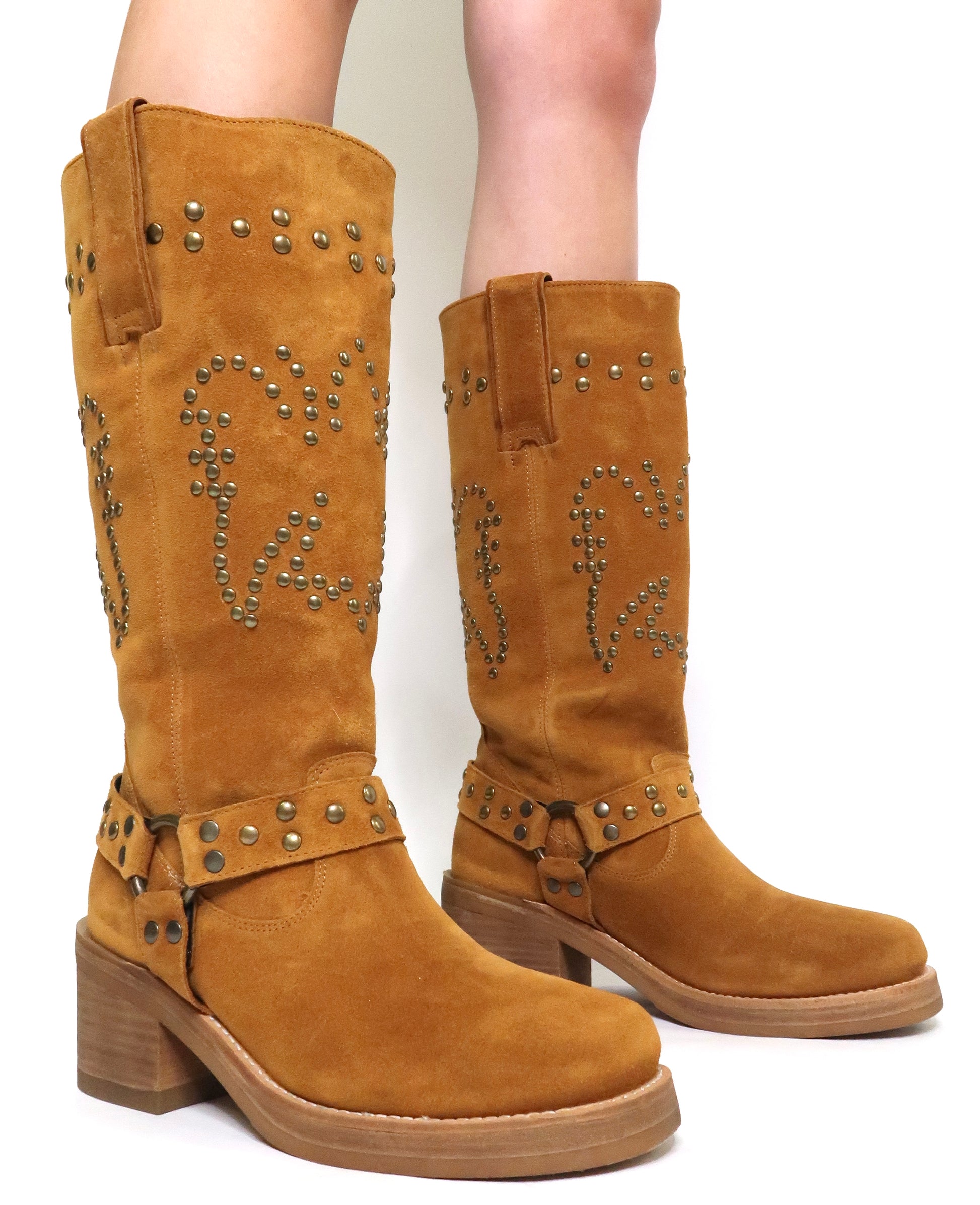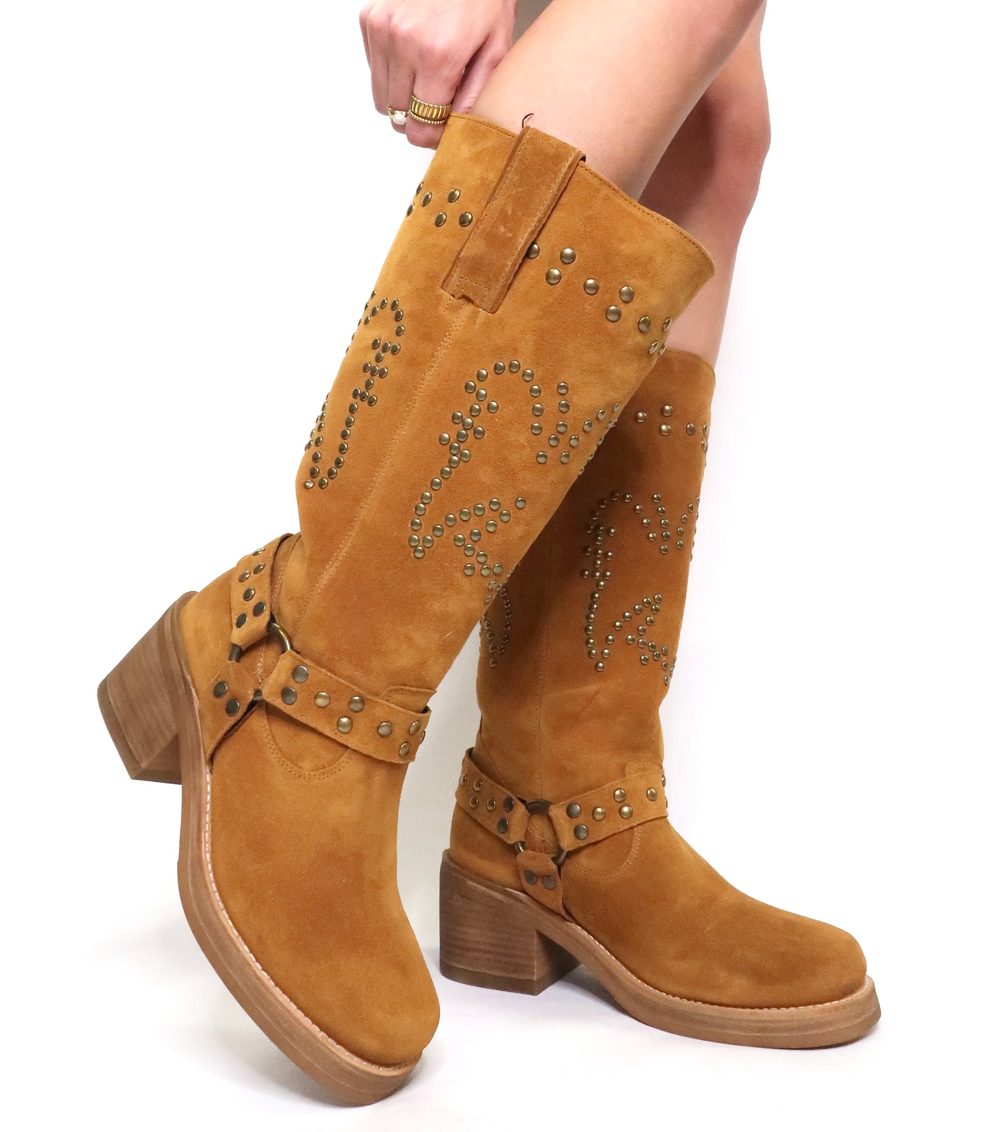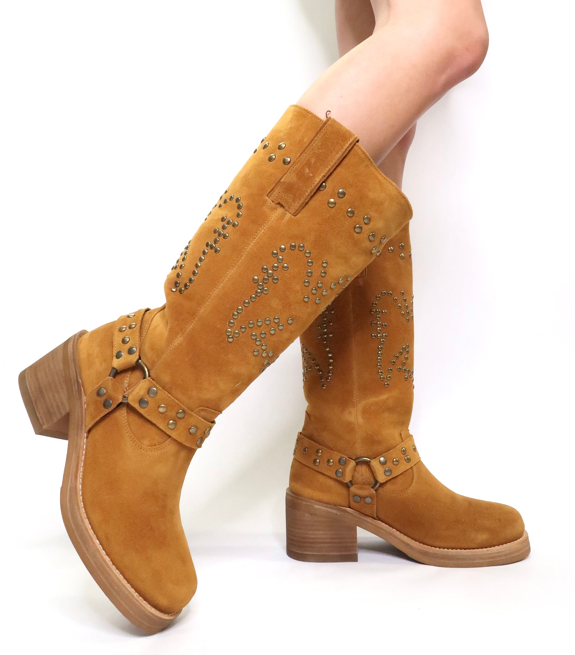 Luxe, bold, and made to turn heads—the Troubadour Boot is a statement piece. Crafted from rich, velvety suede and adorned with unique studded detailing, it’s a perfect blend of vintage charm and rock ‘n’ roll attitude. With a sleek silhouette and effortless edge, the Troubadour is for those who don’t just walk the path—they set the rhythm.