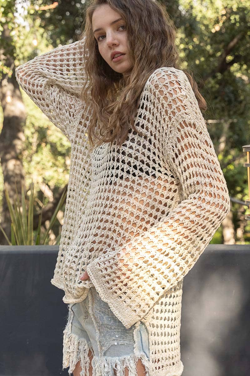 Crochet mesh knit boat neck top with bell sleeve. This can also be worn as a shoulder or off-shoulder top.