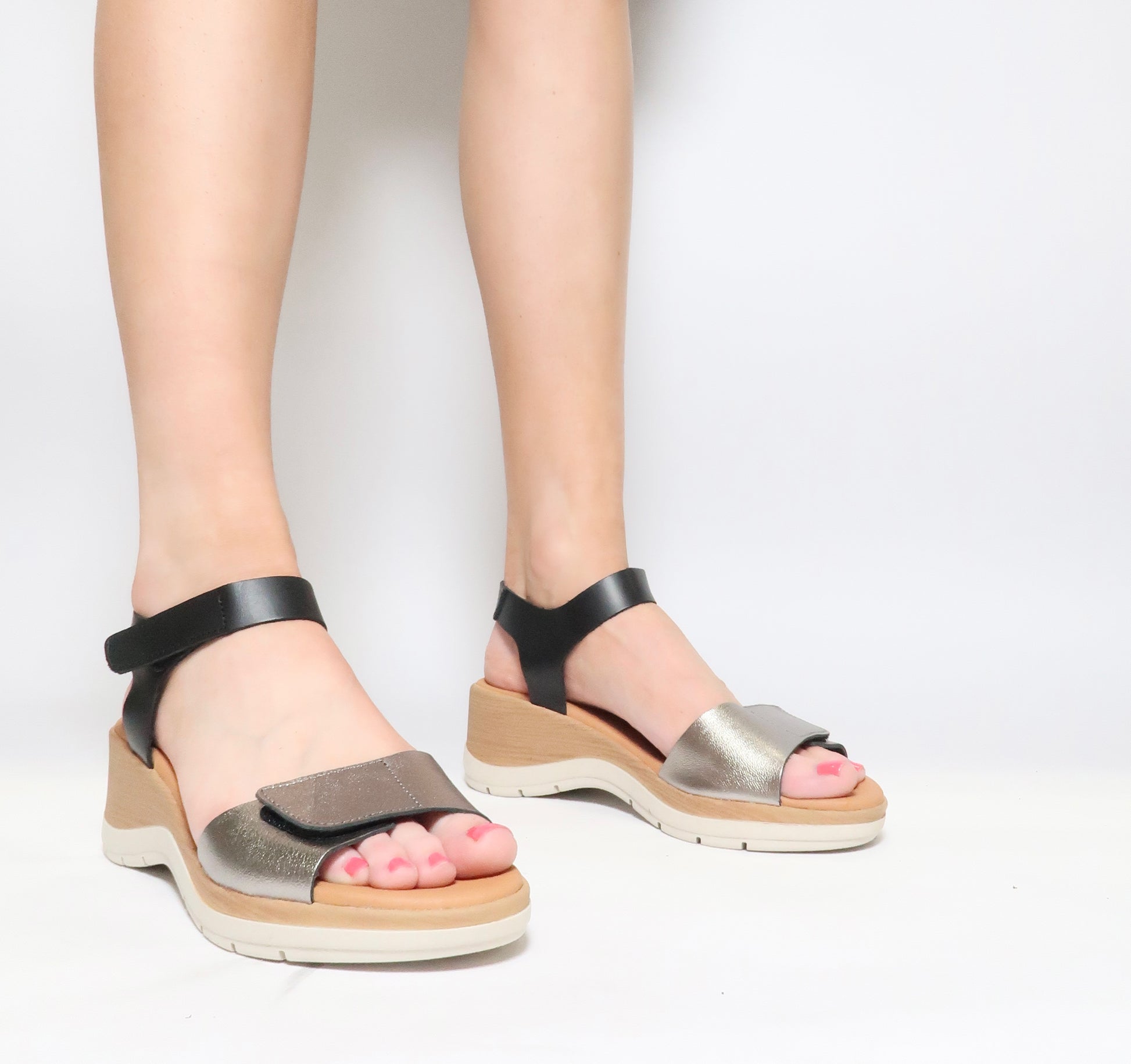 The Eric Michael Caroline is a versatile wedge sandal featuring a stylish peep toe and double hook and loop straps. Crafted with exceptionally soft leather and an extra cushioned footbed, it provides all day comfort and a personalized fit. The lightweight rubber outsole and moderate 2.5 inch heel make it an ideal choice for a sophisticated yet effortless look.