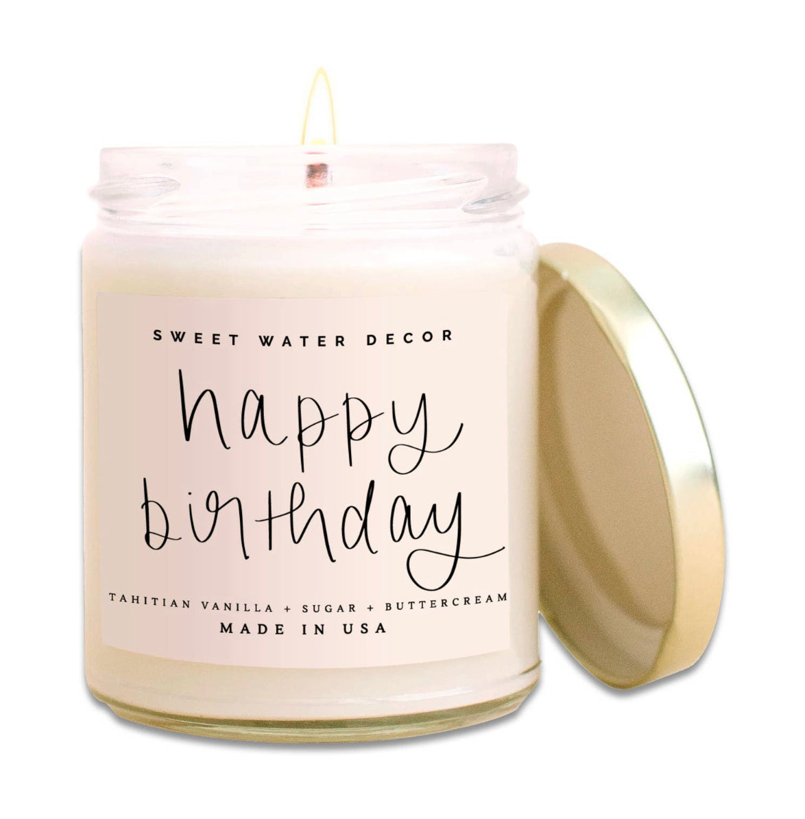 SCENT NOTES: • Top: Tahitian Vanilla • Middle: Powdered Sugar • Base: Buttered Rum Hand poured in the USA, our clear jar vessel looks great in any space. Our festive Happy Birthday candle is perfect for birthdays, gifts, spring, summer, spring decor and home decor!