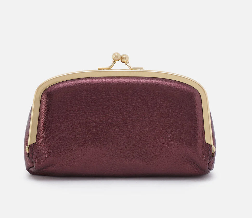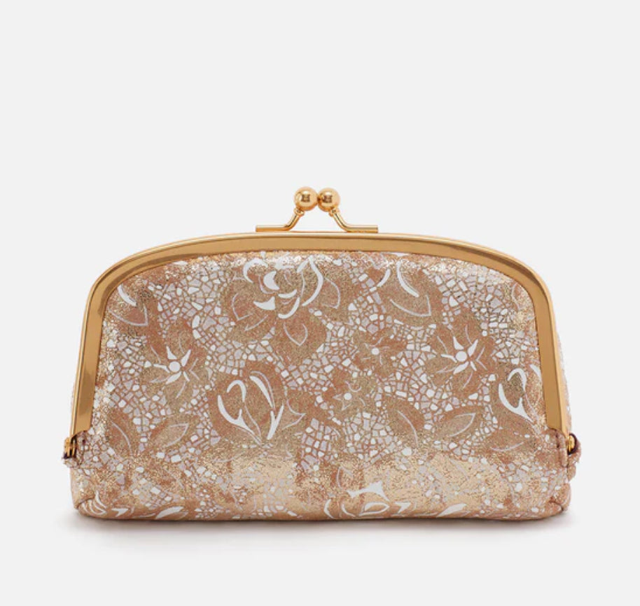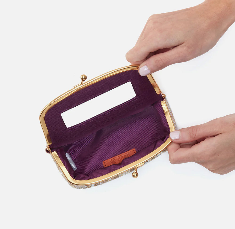 This vintage-inspired pouch has room for your lipstick and small essentials, plus a mirror for on-the-go touch-ups! Crafted in Printed Leather.