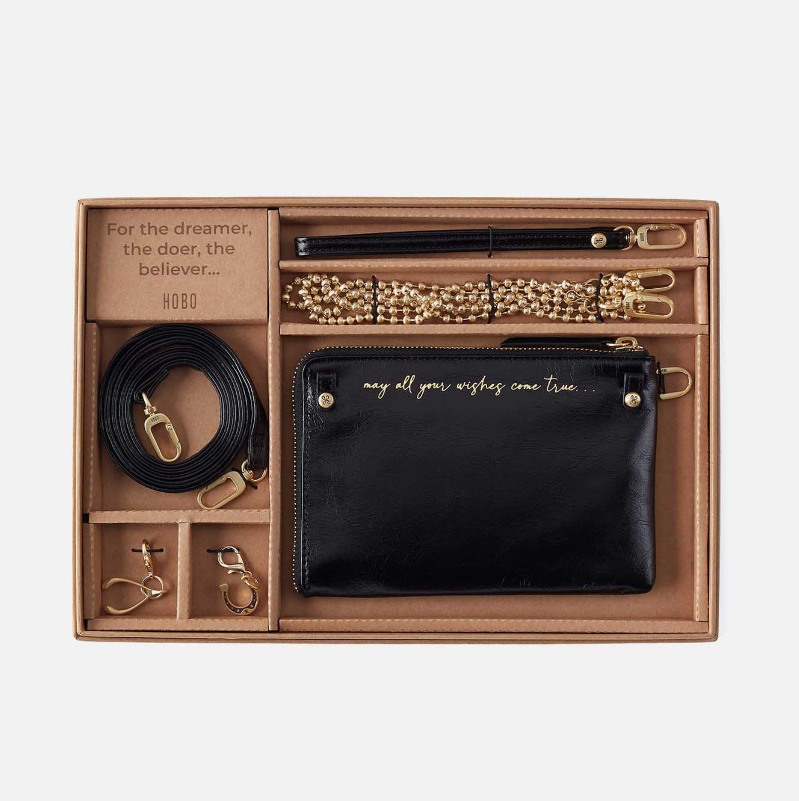 This gift set includes a crossbody pouch with removable straps and charms, in a custom box display.