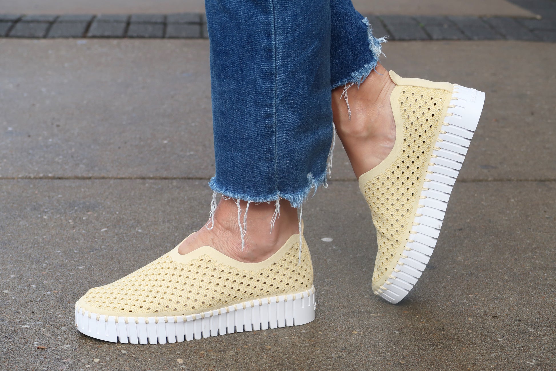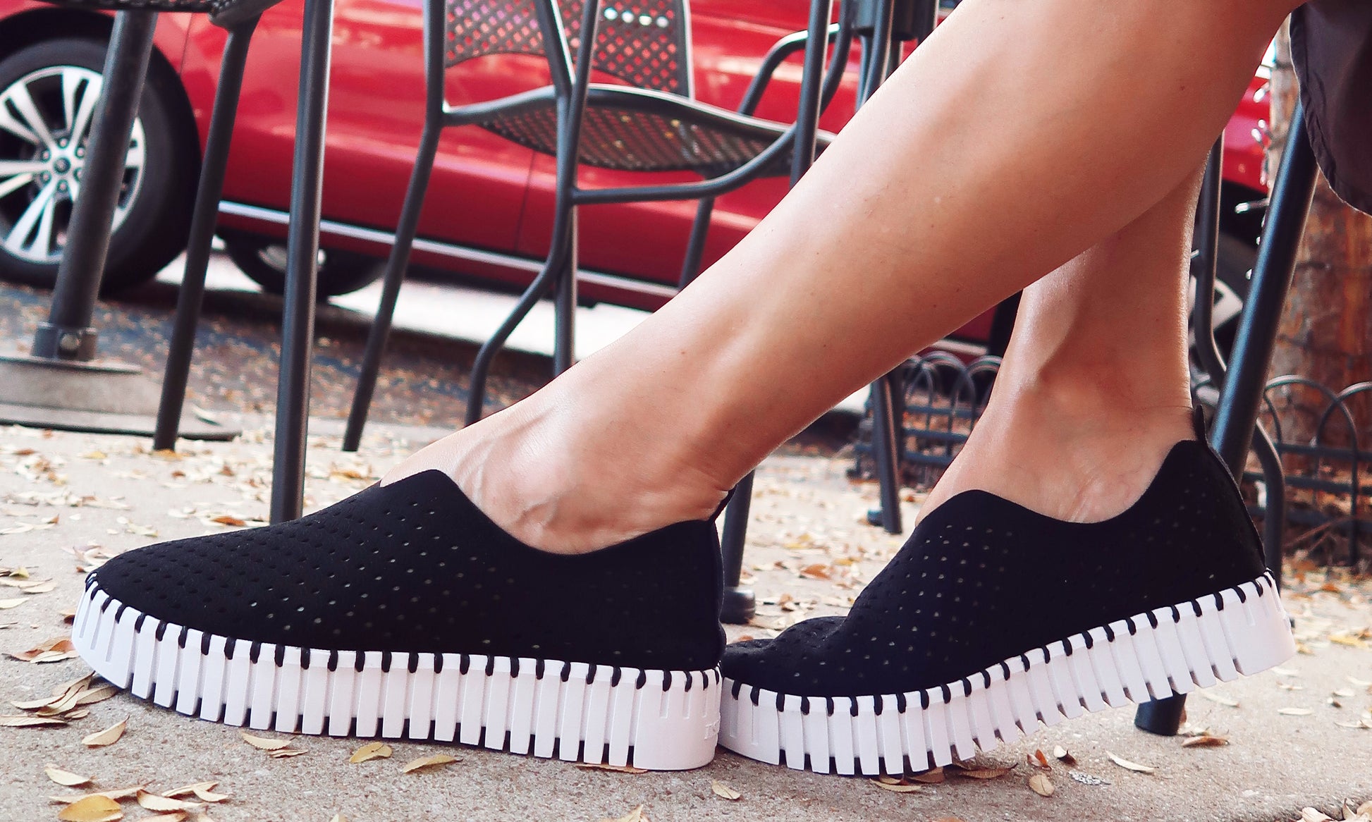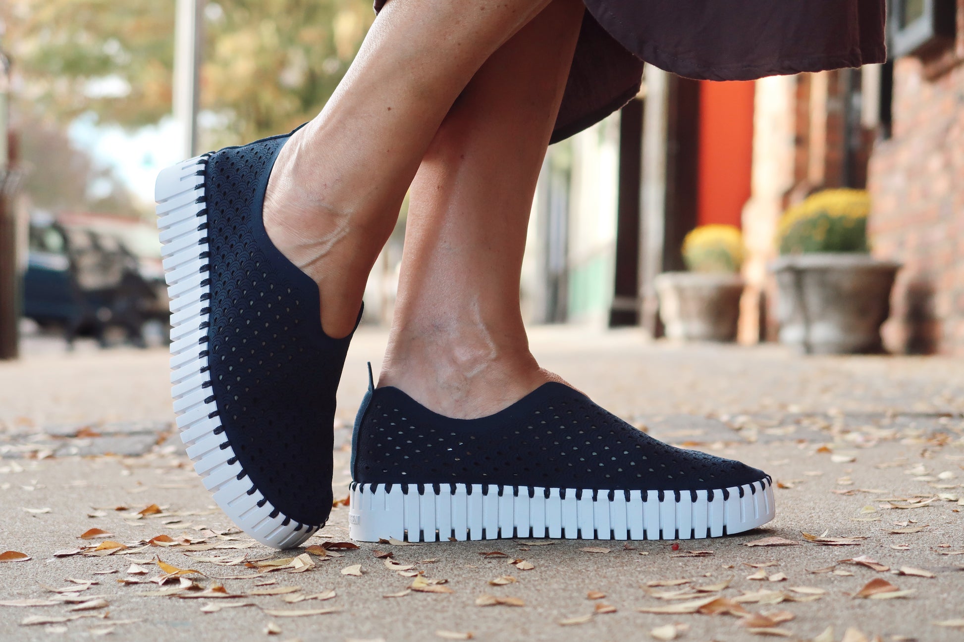 Platform Tulip shoe. The upper is made of recycled microfiber with a decorative laser cut pattern. It is attached to the outsole with matching recycled thread, using no glue. Inside the shoe is a soft and comfortable insole lined with pigskin.