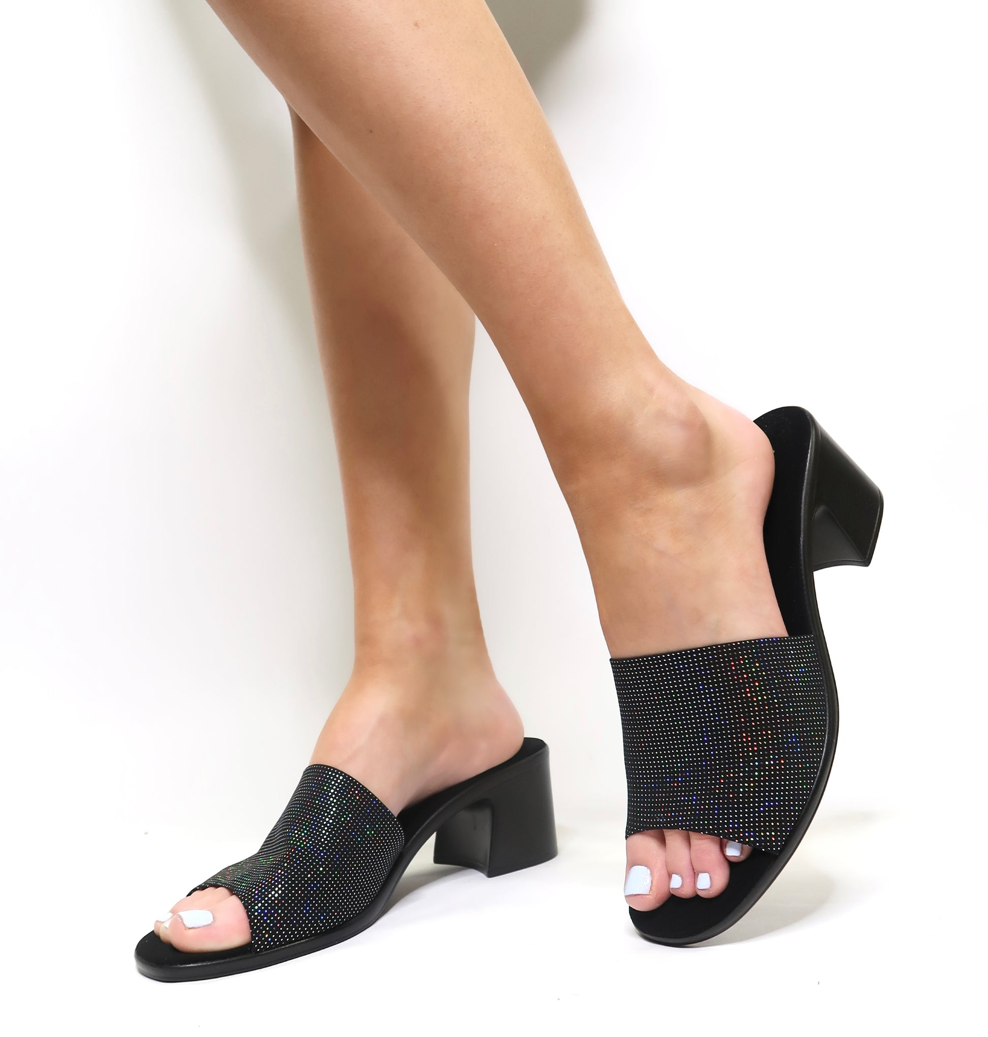 Rebecca, a modern twist on a classic silhouette. Iridescent elastic upper, flexible slip-on design for all-day comfort. Perfect for evening events or adding shimmer to your everyday look. Must-have for any fashion-forward collection.