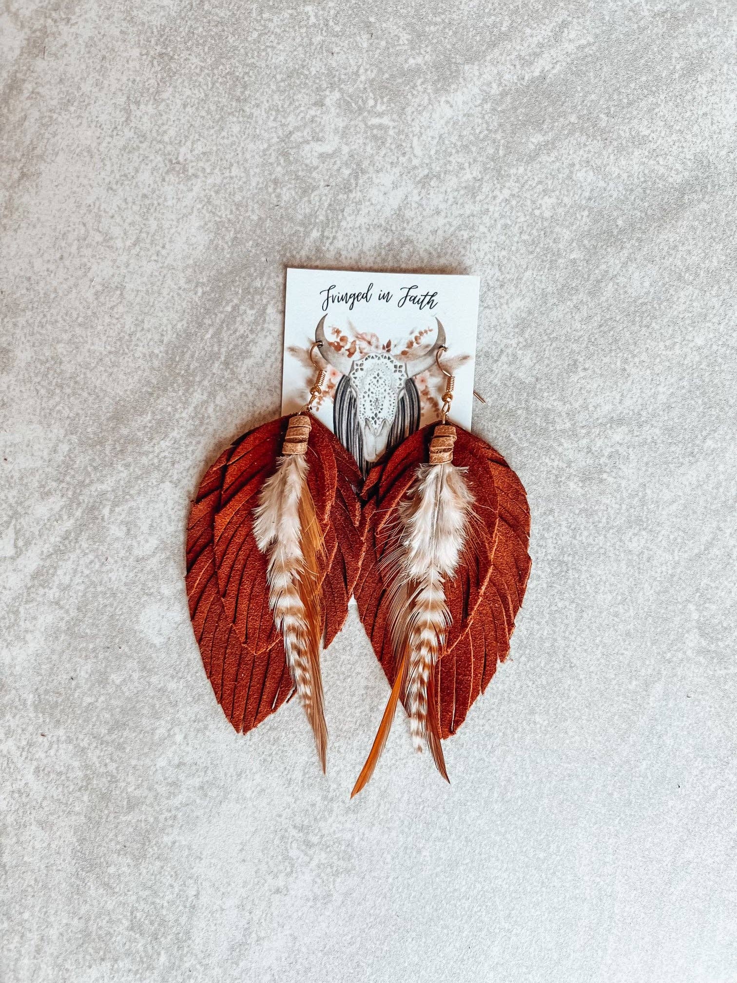 If you love our feather earrings but want them in a smaller version these are perfect for you! Beautiful feather bundle wrapped in leather backed with a leather fringe feather. This statement earring looks stunning and is sure to grab the attention of others!