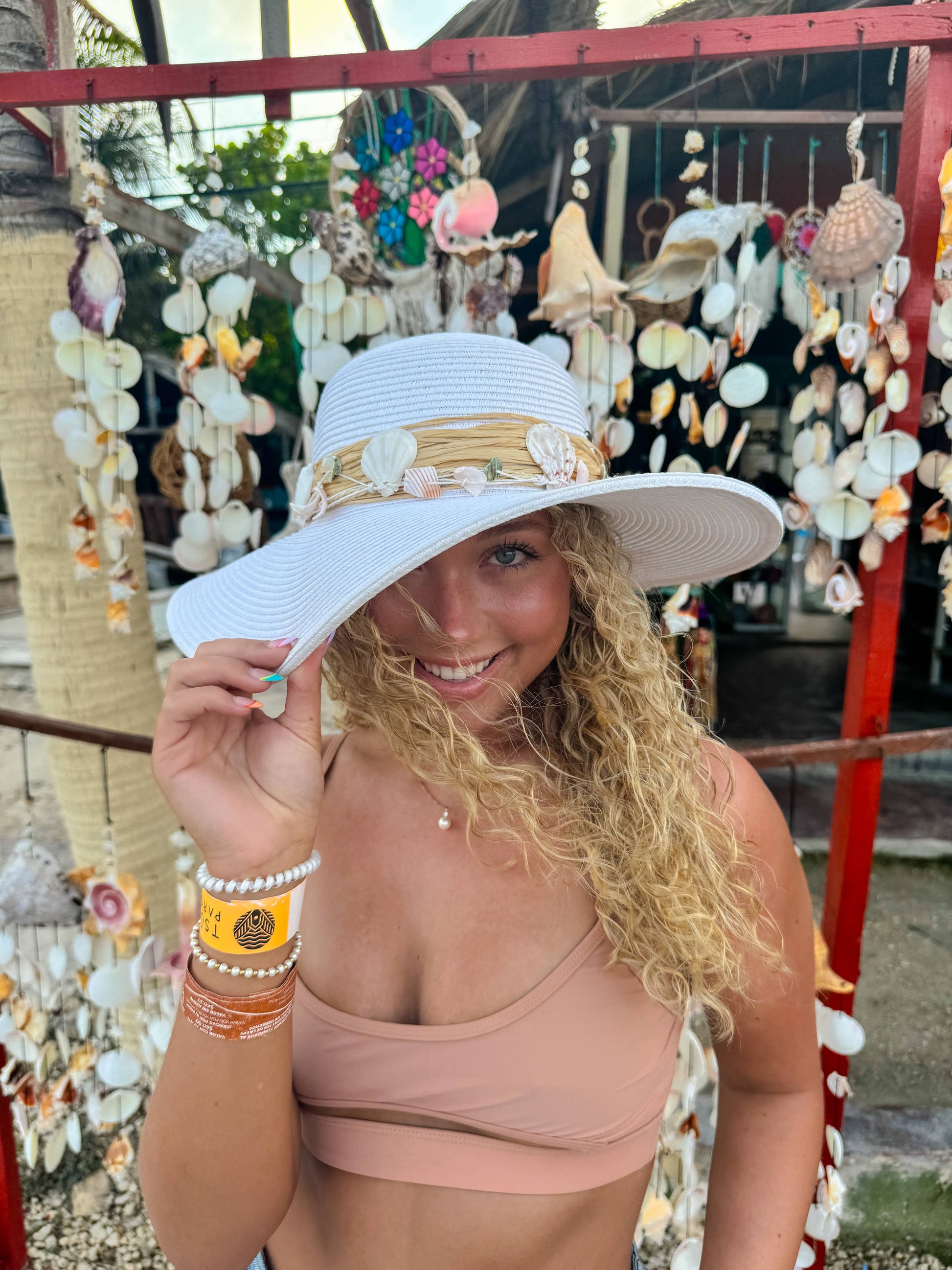 Add a touch of coastal charm to your summer look with our Shell Trim Wide Brim Sun Hat! Featuring a beautiful shell band and raffia bow, this hat is perfect for the beach or pool. With its wide brim, it provides ample sun protection while still looking gorgeous. (Shell-iously stylish!)