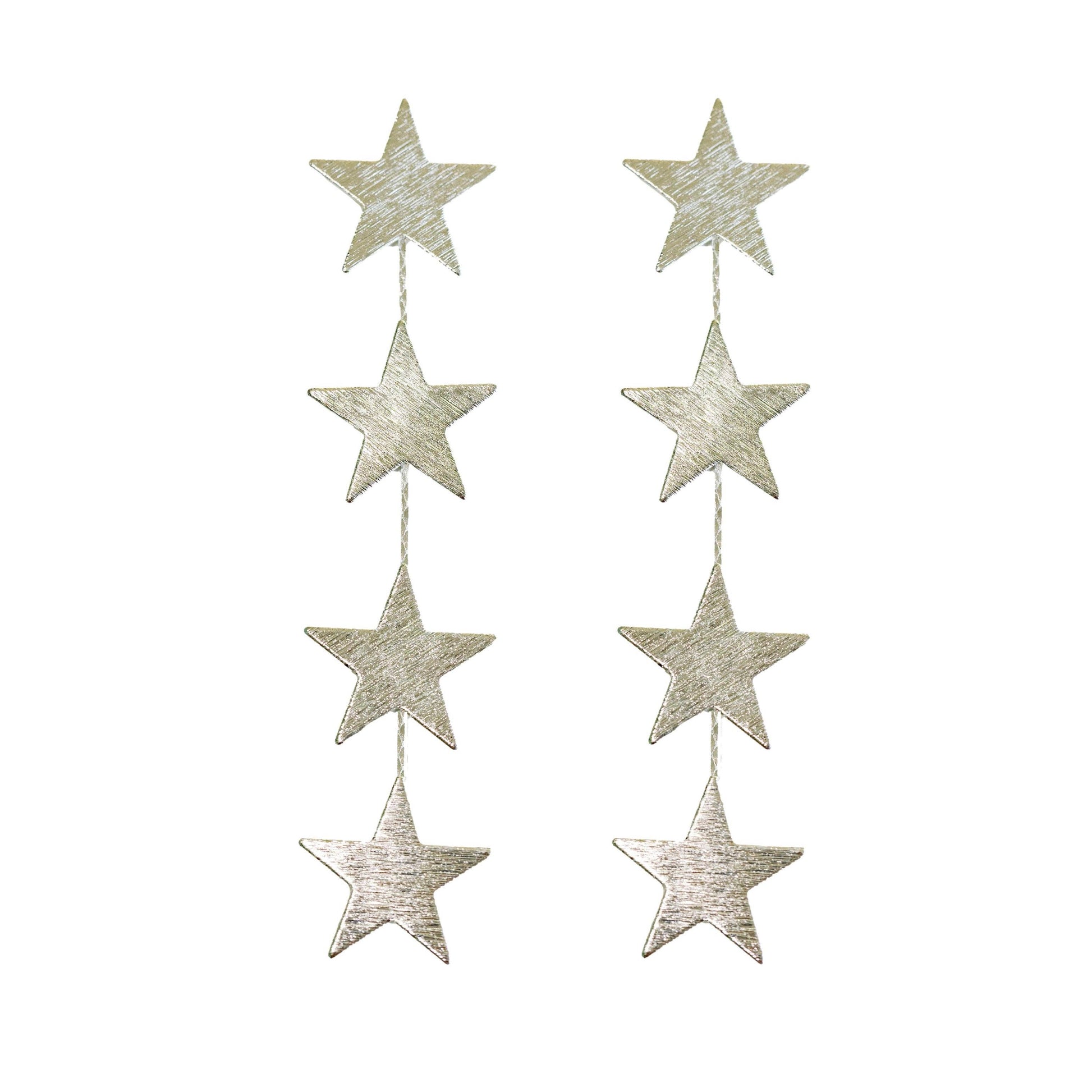 Shine bright this 4th of July with our stunning Silver Star Statement Earrings, featuring four interlinked stars that radiate patriotic charm. These dazzling earrings are the ideal accessory to complement your red, white, and blue outfits, adding a touch of sparkle to your festive celebrations. At 3.5 inches long, they are essentially weightless, ensuring comfort while making a bold statement.