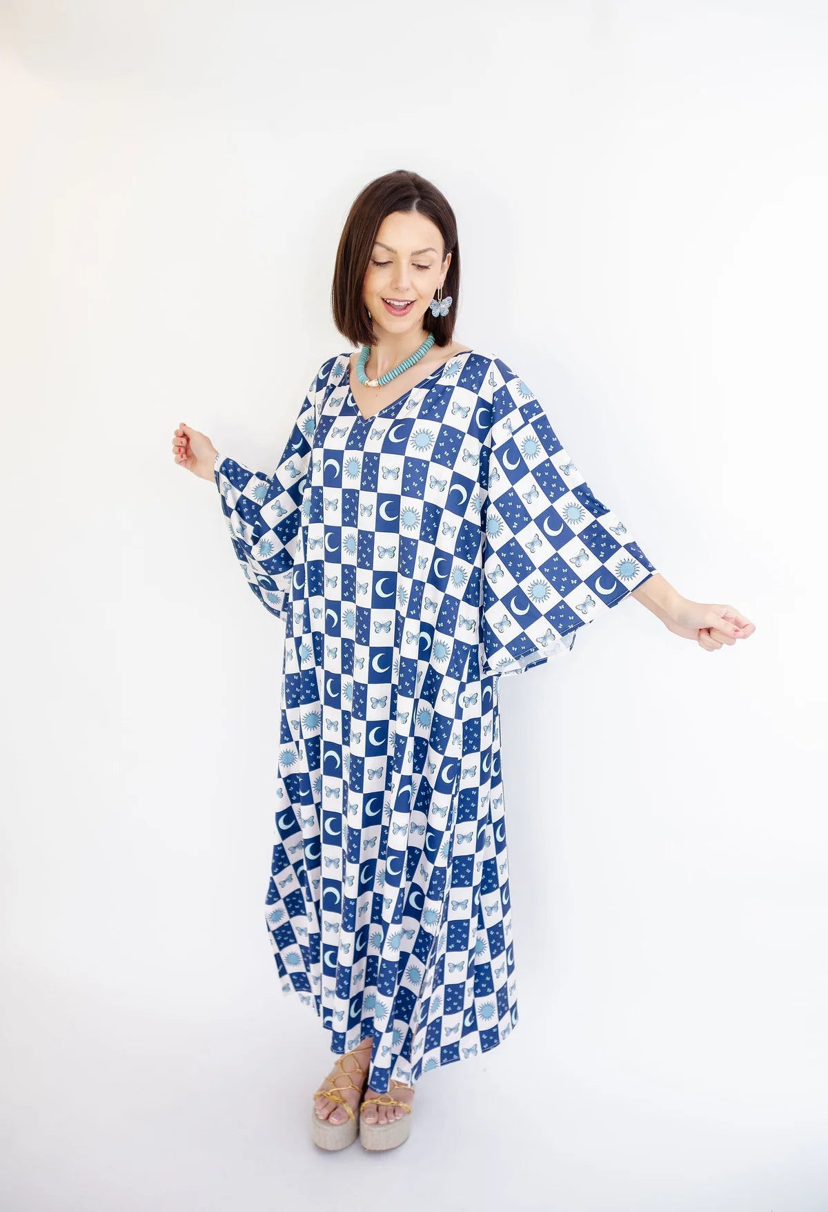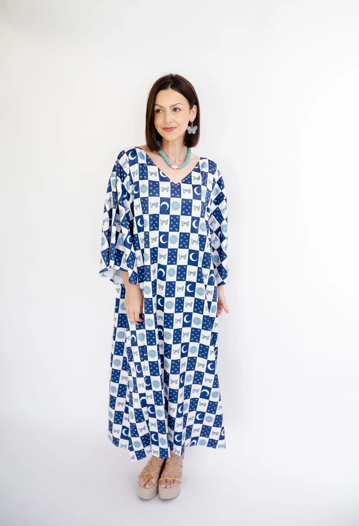 Our Goldie Maxi was designed to be an elevated caftan that can transition from day to night. It features our exclusive Soleila hand painted prints digitally printed on cotton silk.