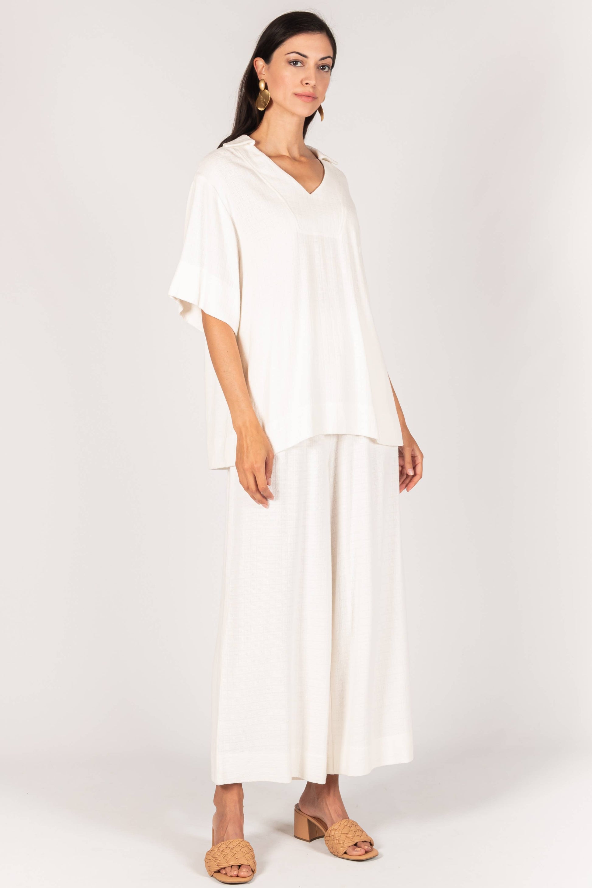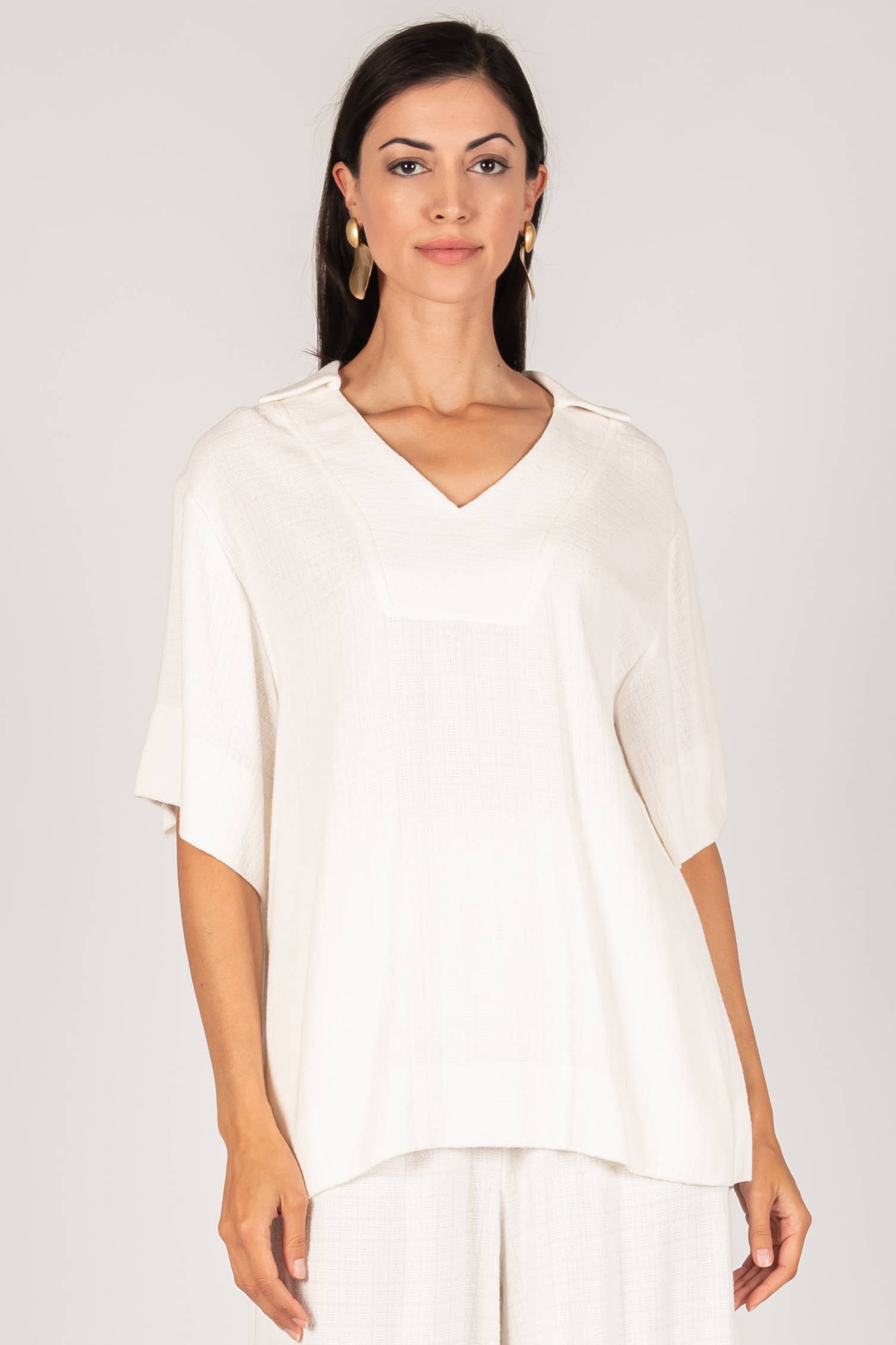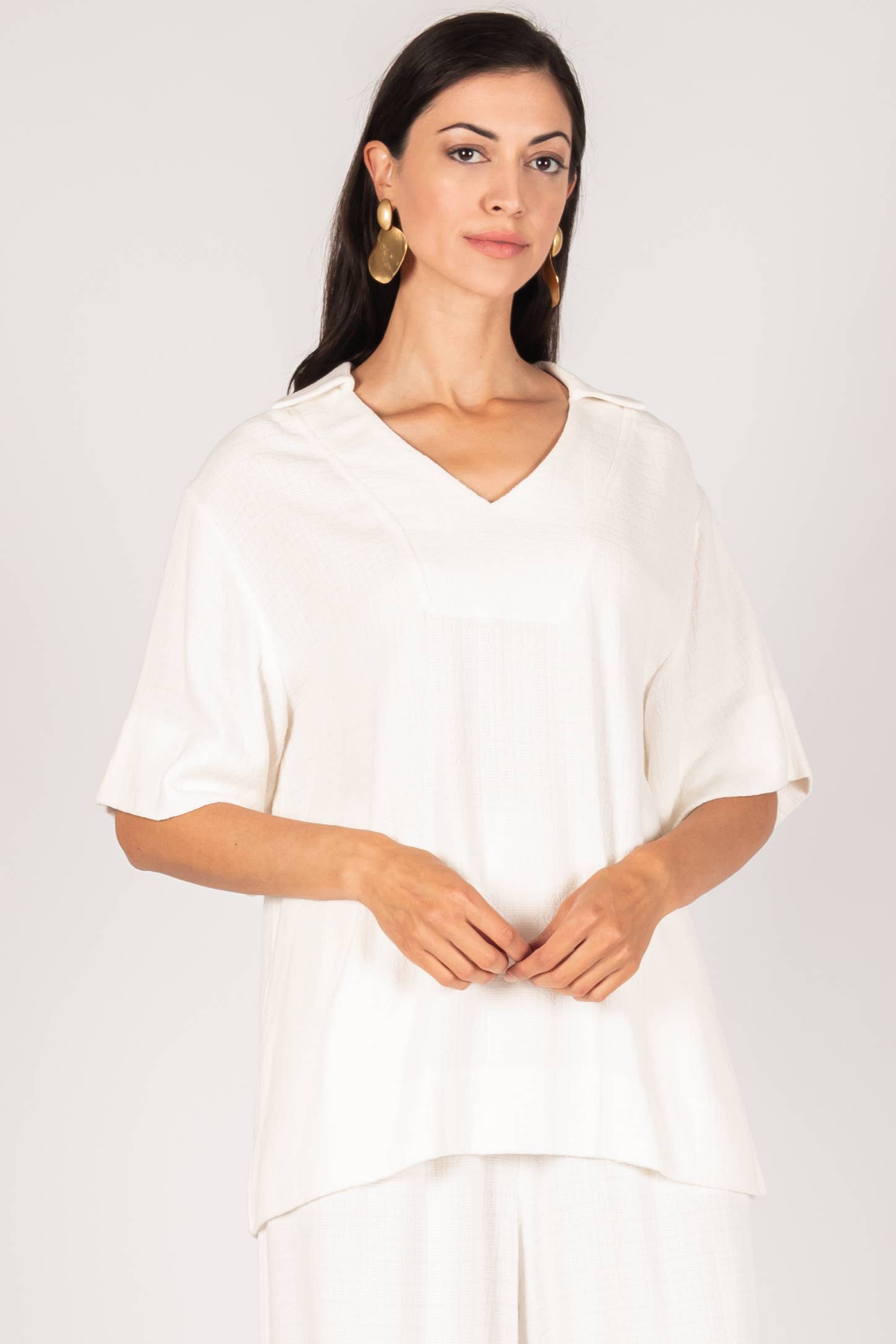 Linen fabrication - Collared - Short sleeve - V-neck - Side slits