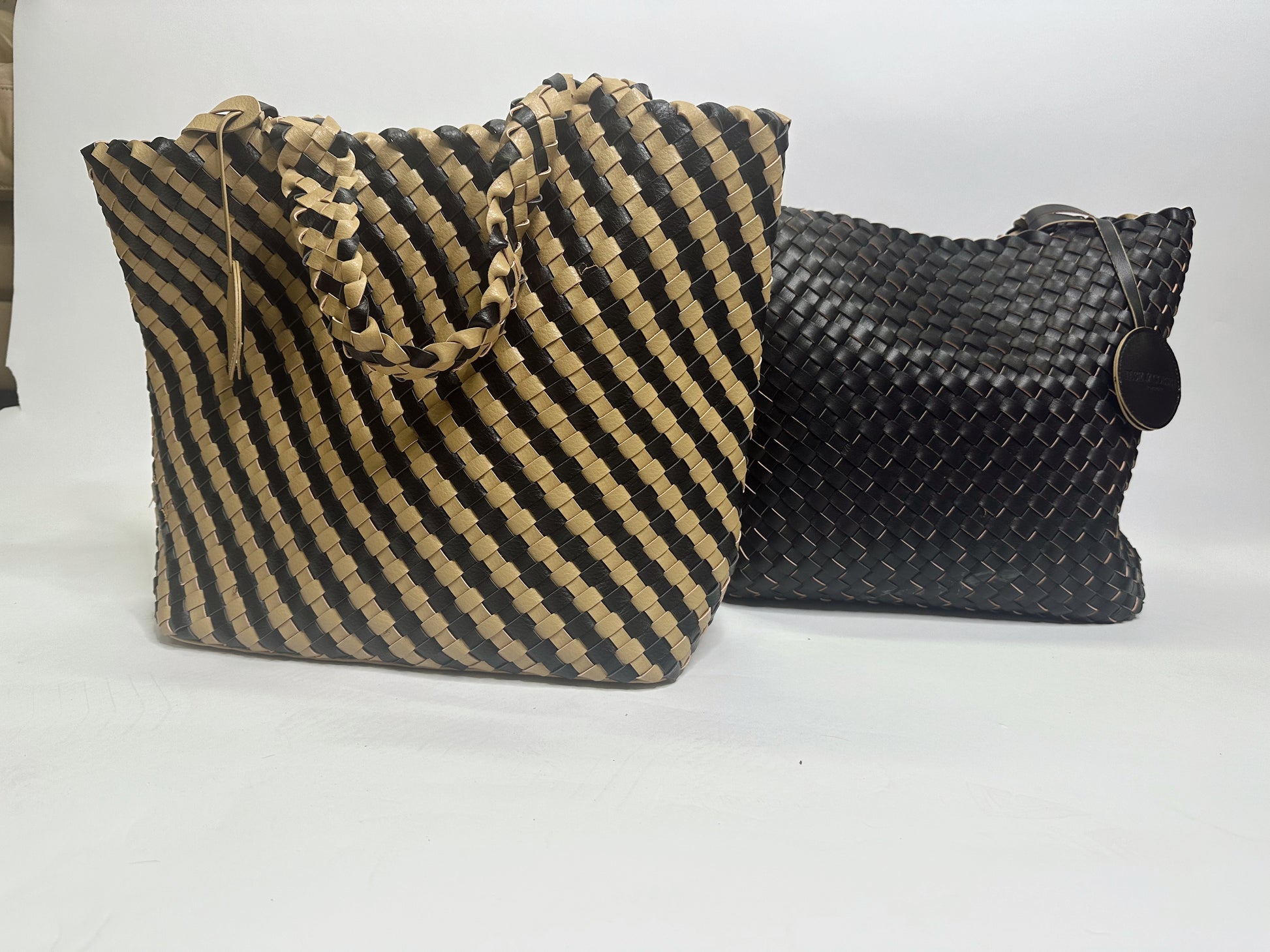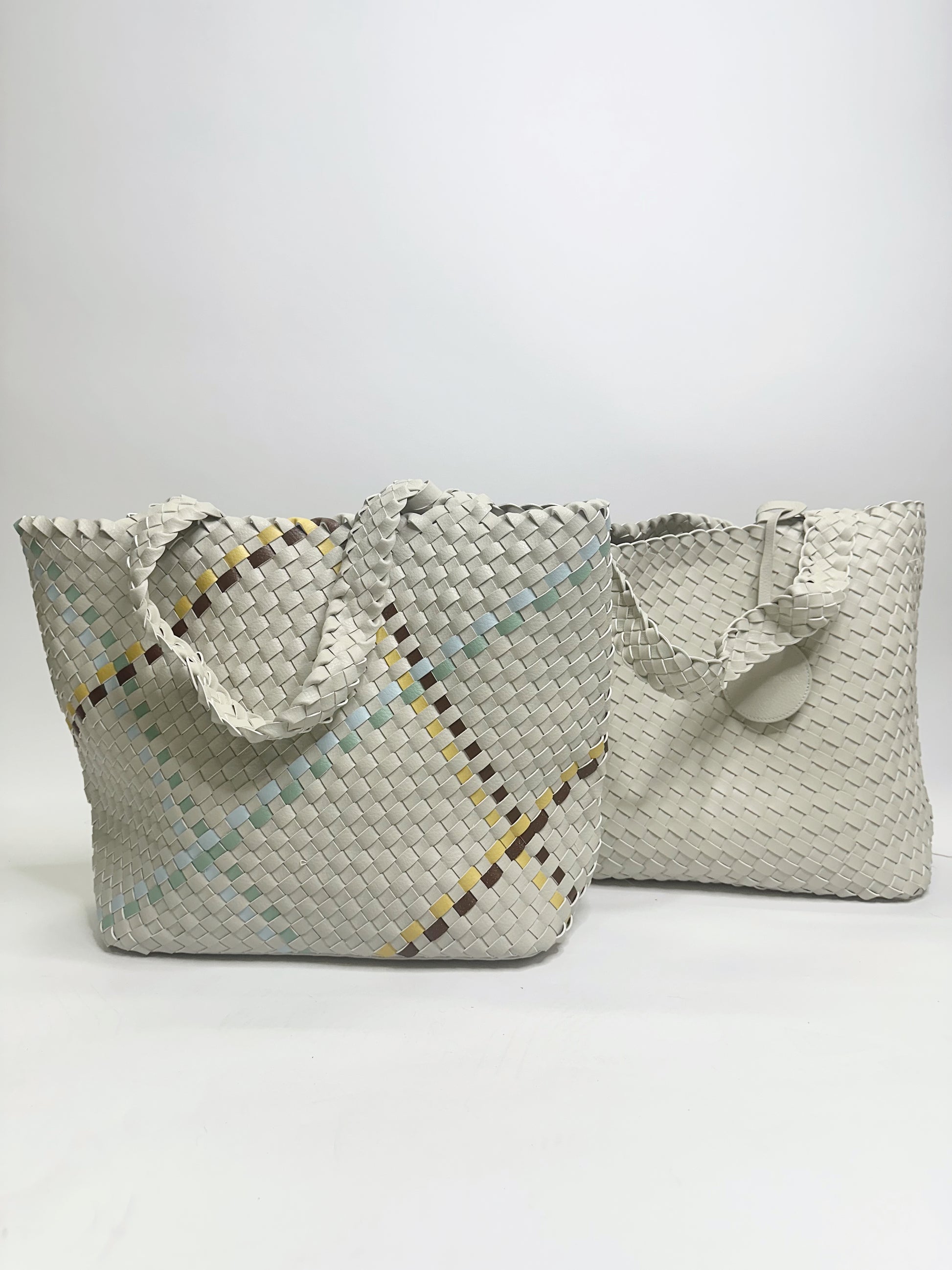 Reversible shopper by ILSE JACOBSEN HORNBÆK. This bag is made of braided soft faux-leather and offers double styling options as it is reversible. The reversible match colored logo tag features a hidden snap hook, easy to attach your wallet or keys to secure them from getting lost at the bottom of your shopper.