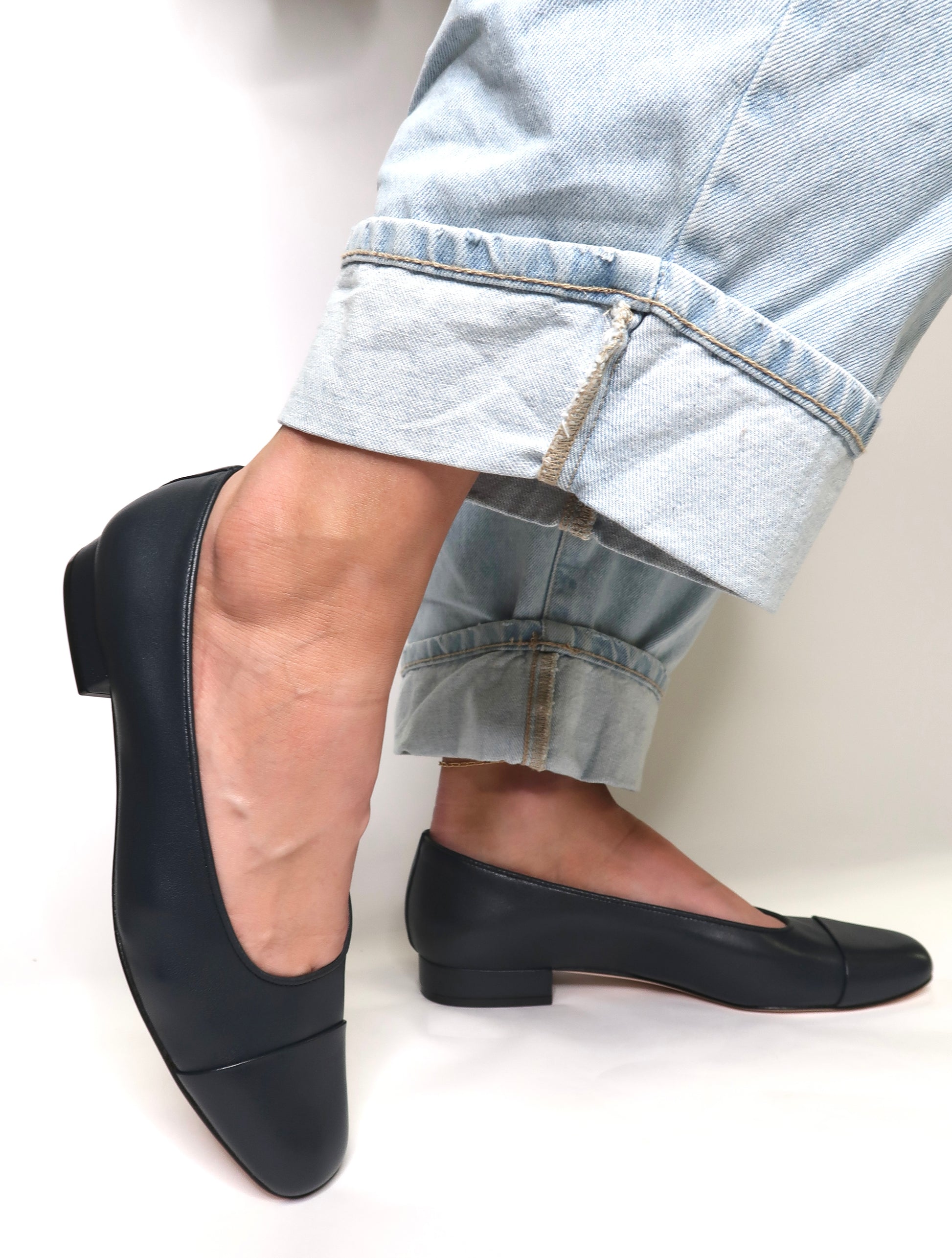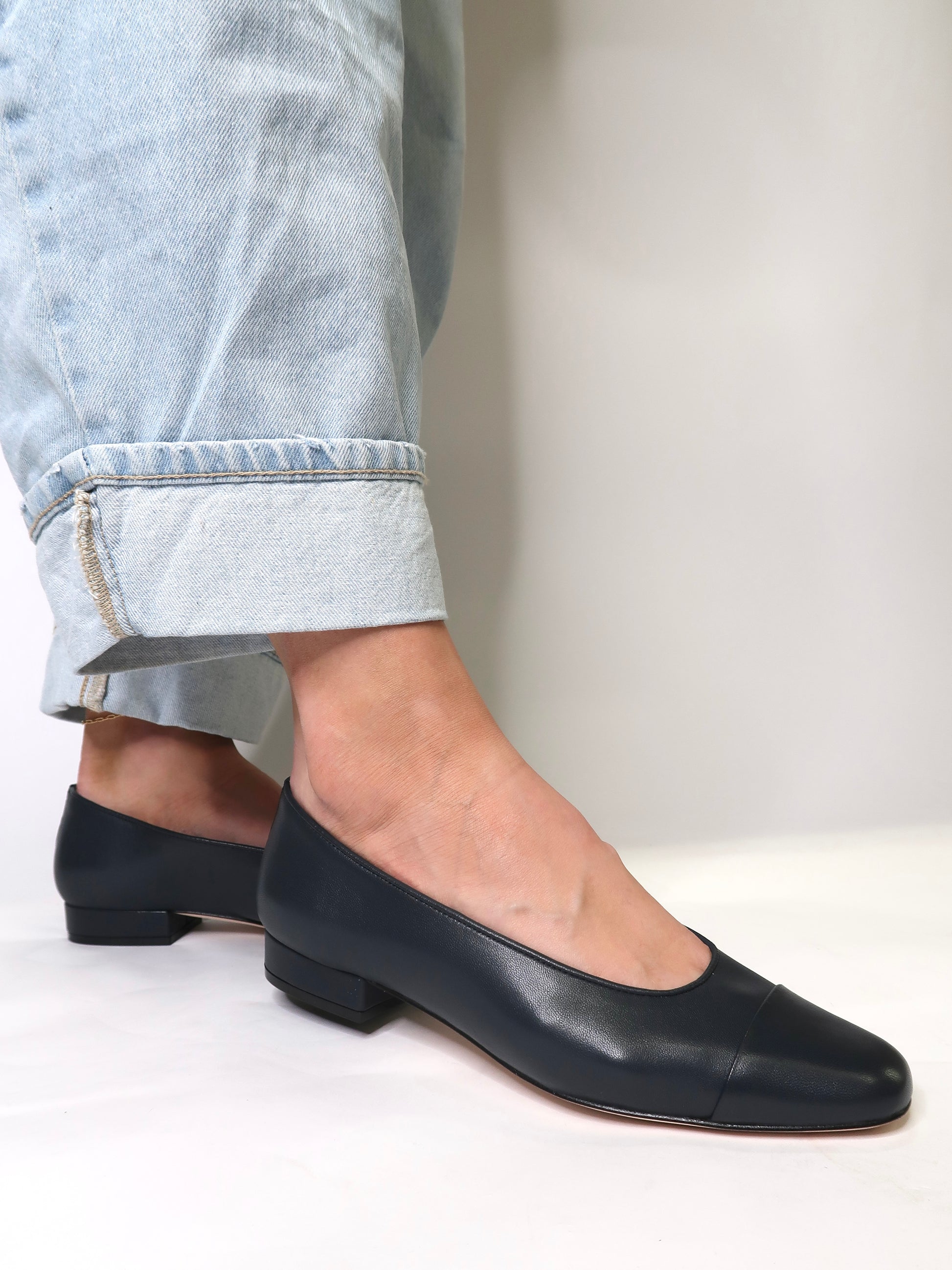 Cap-toe flat. Unlined for exceptional comfort. Buffed leather sole. .75 inch covered heel