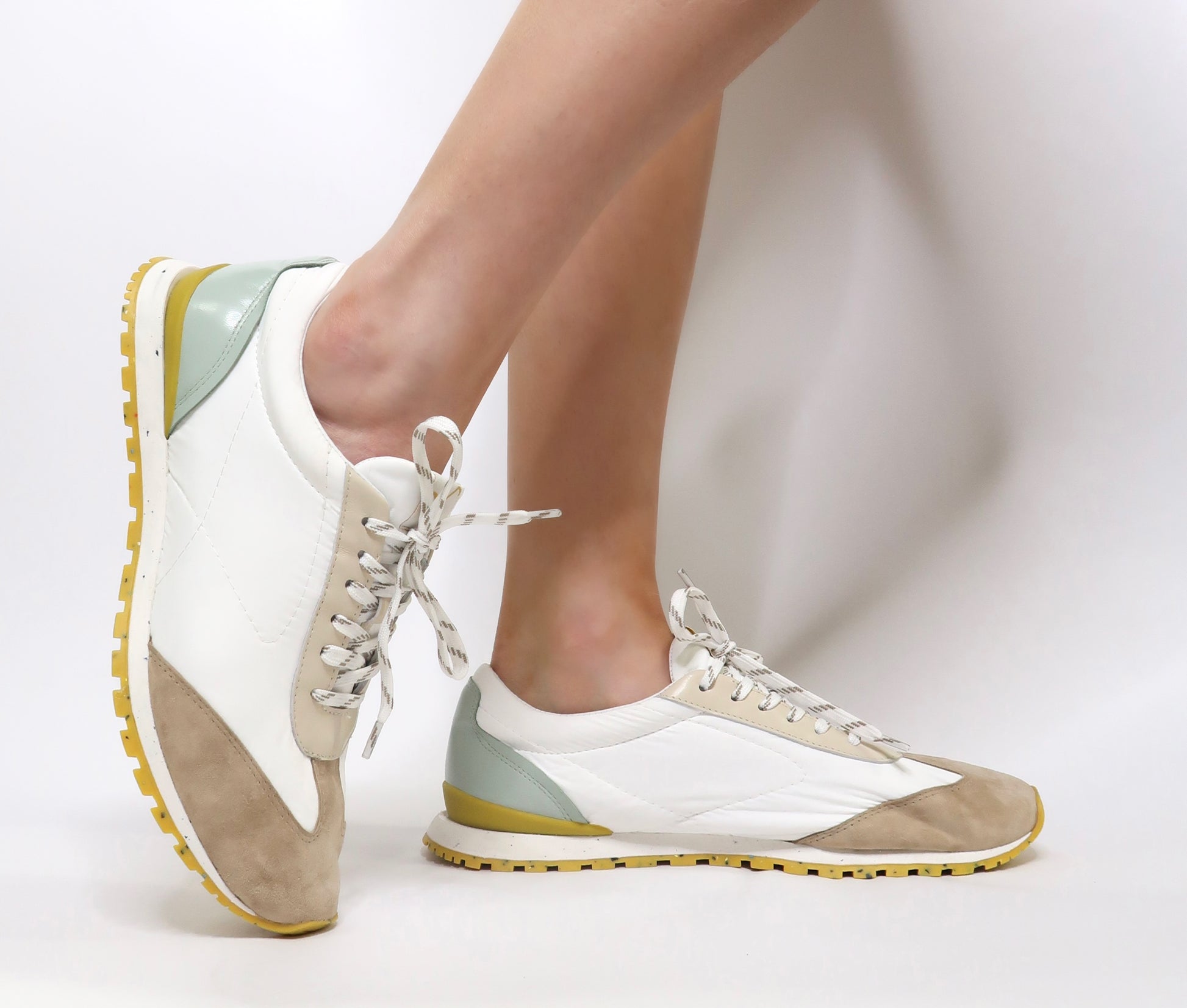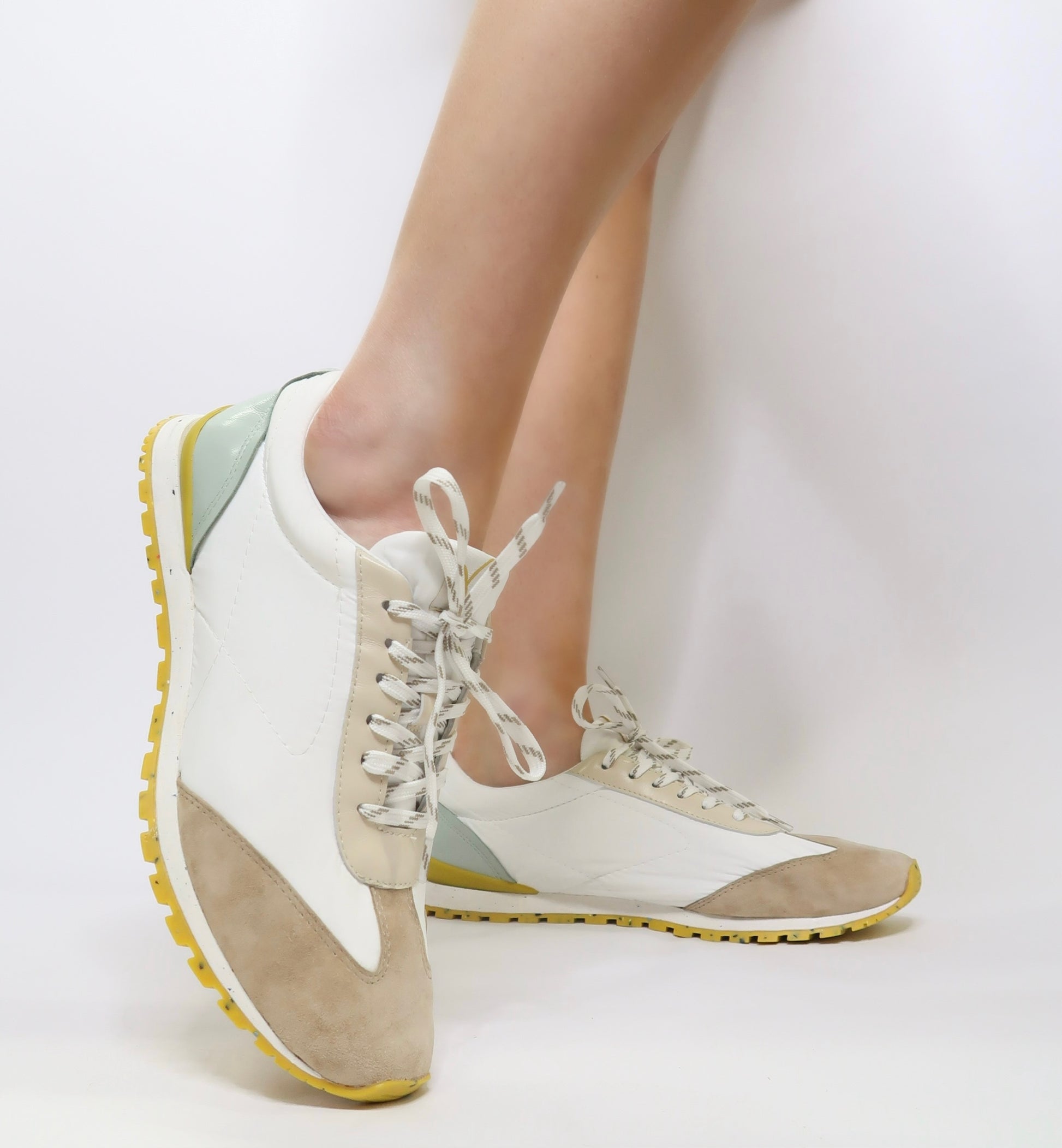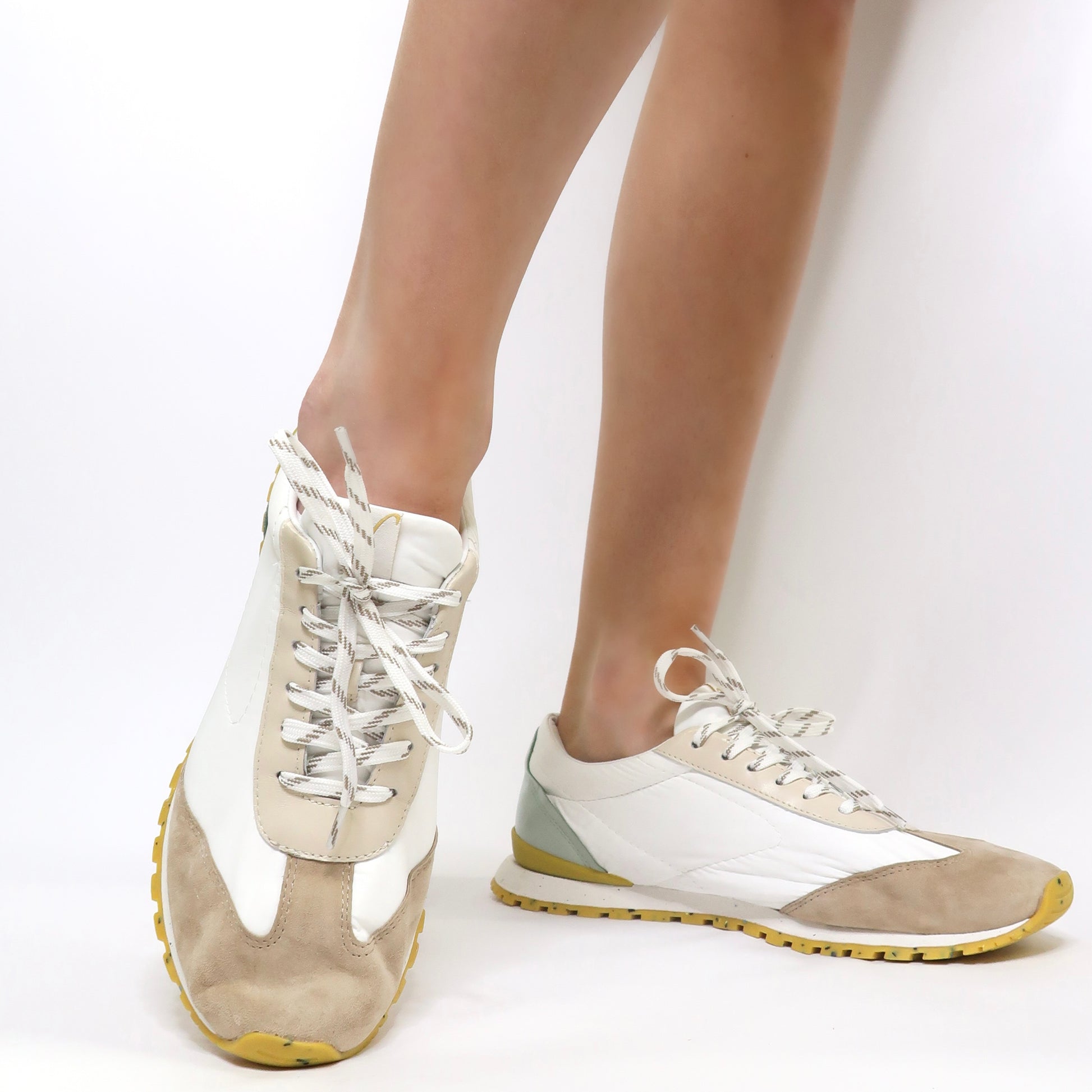 Retro-inspired lightweight mixed-media sneaker. Two-tone flexible rubber sole. Padded removable insole.