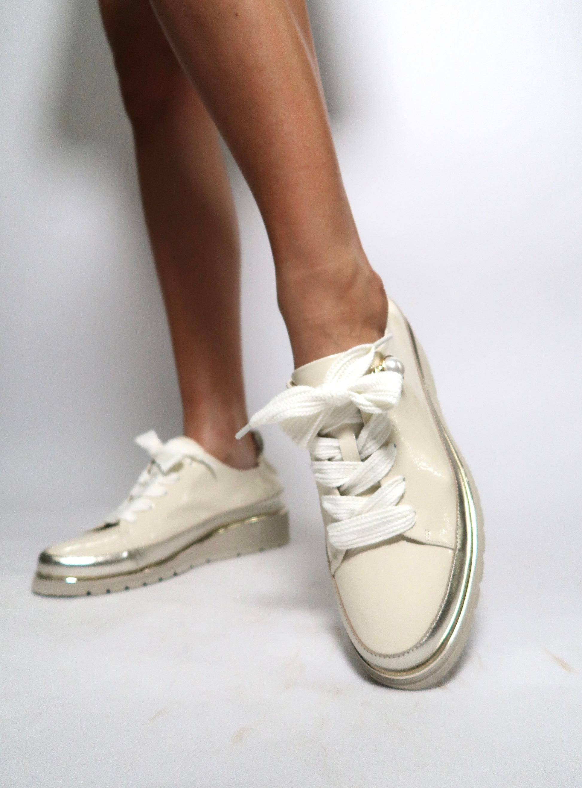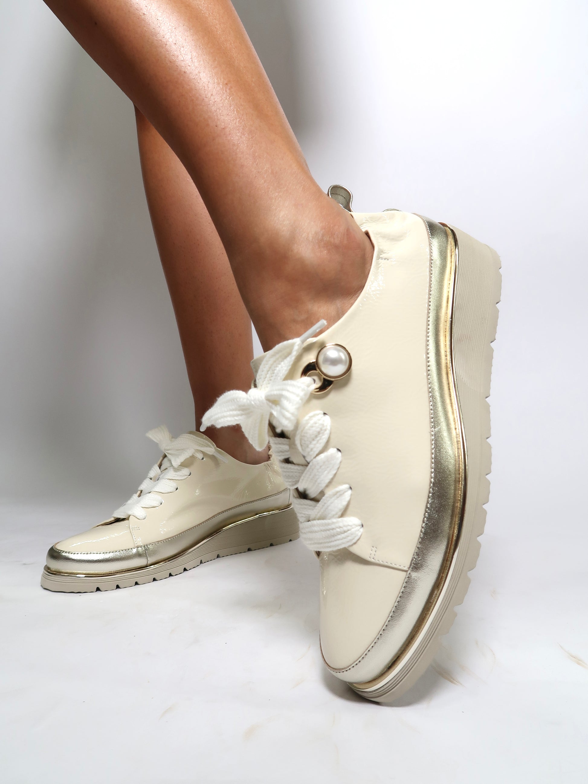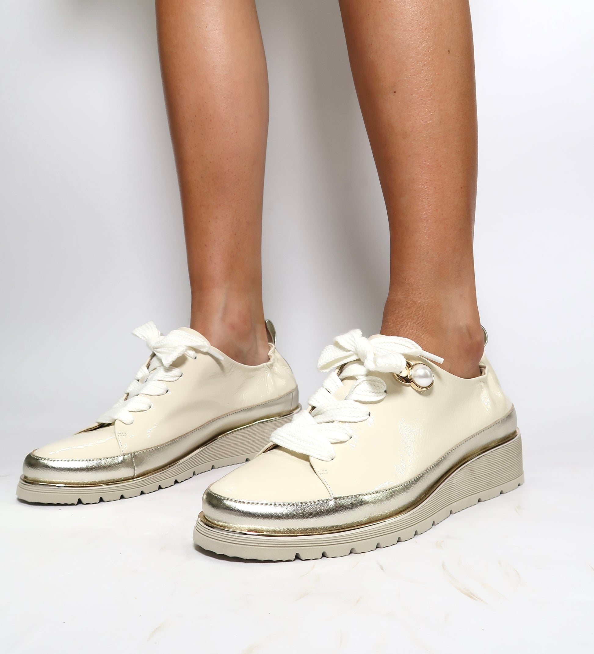 Lace-up athleisure shoe. Faux pearl at topline. Stretch heel with leather heel pull. Ultra-padded removable insole. 1.5 inch grooved rubber sole.