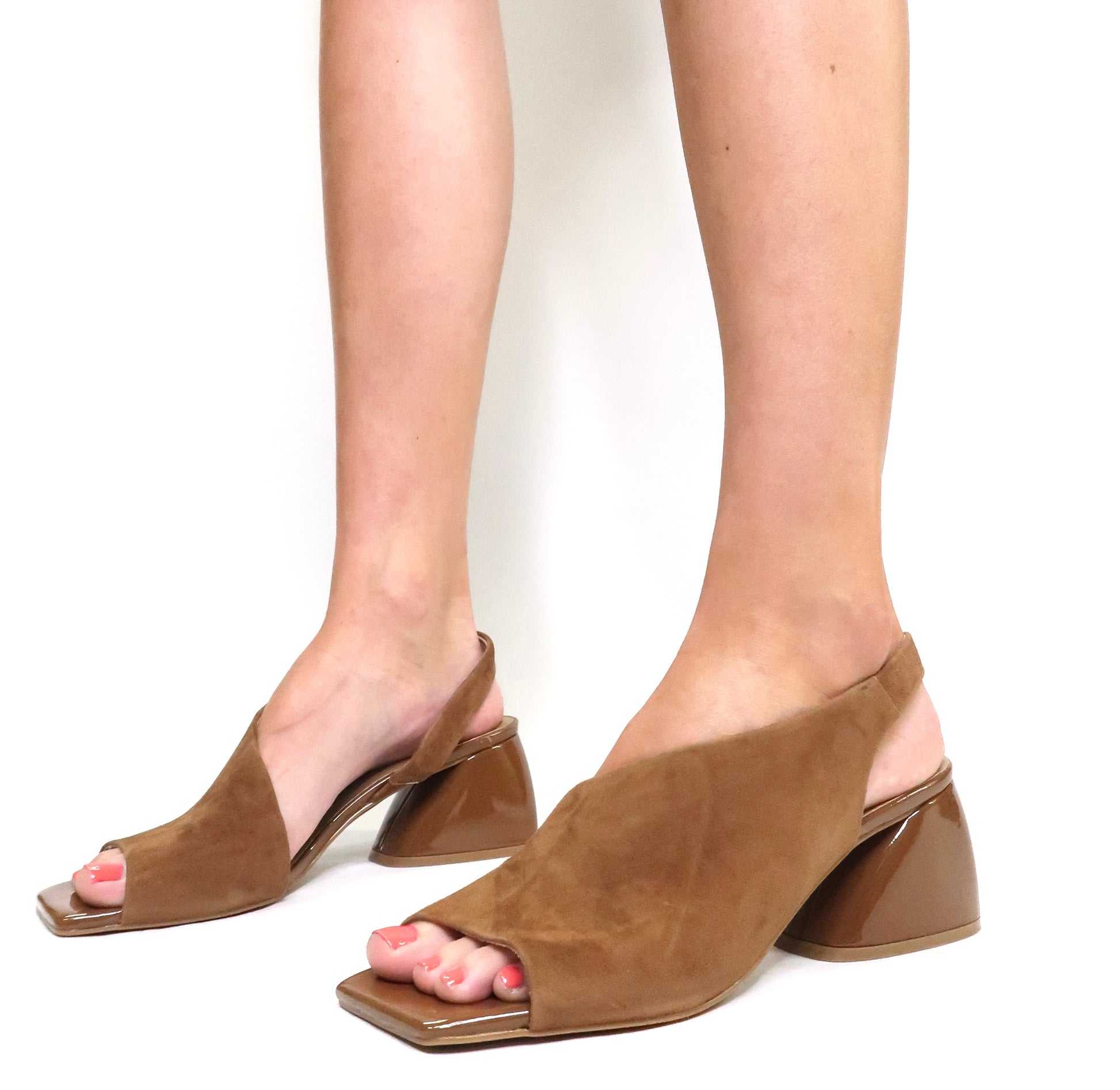 sandal. Patent square toe. Stretch insert on strap. 2.25 inch sculptural covered heel.