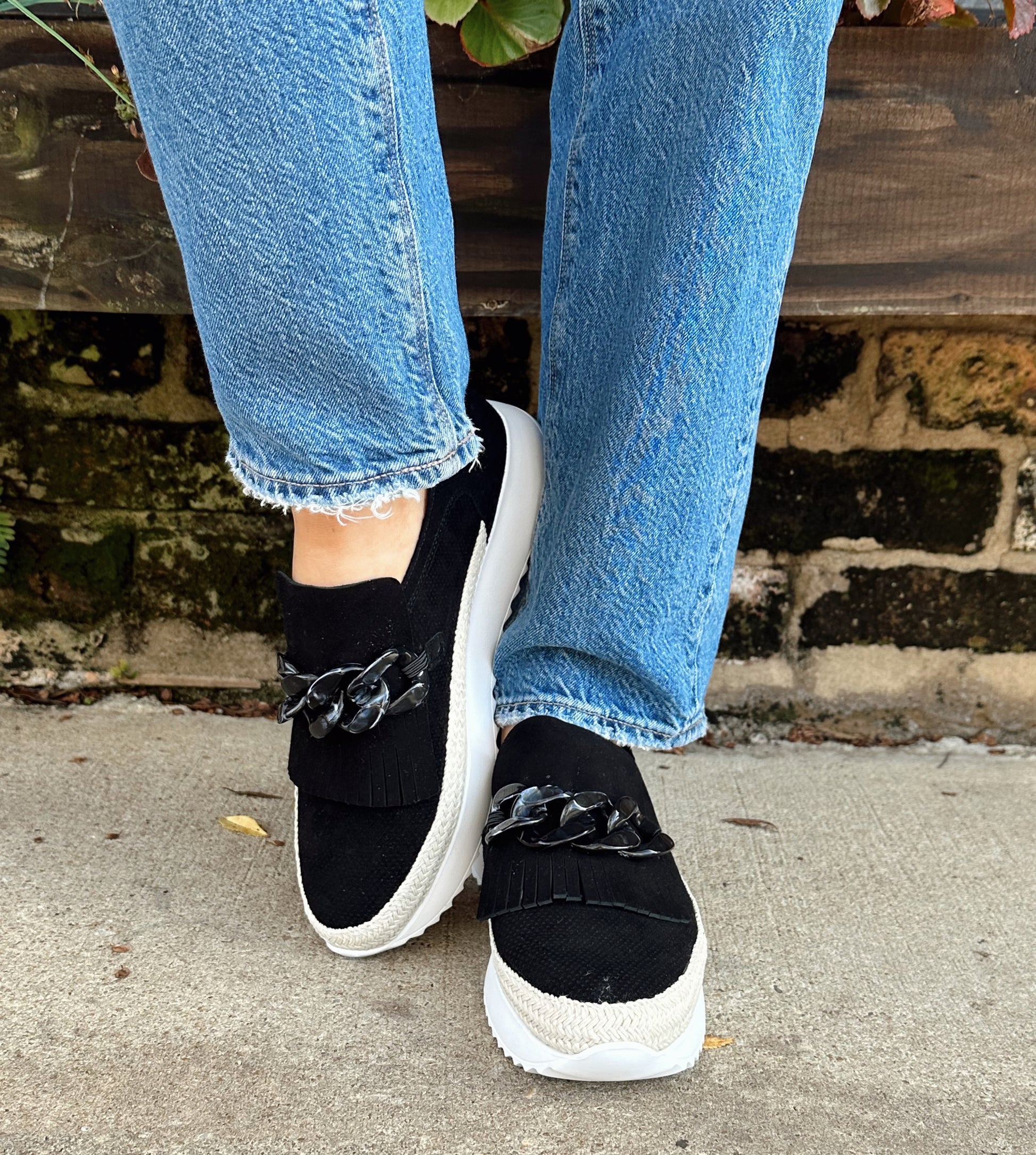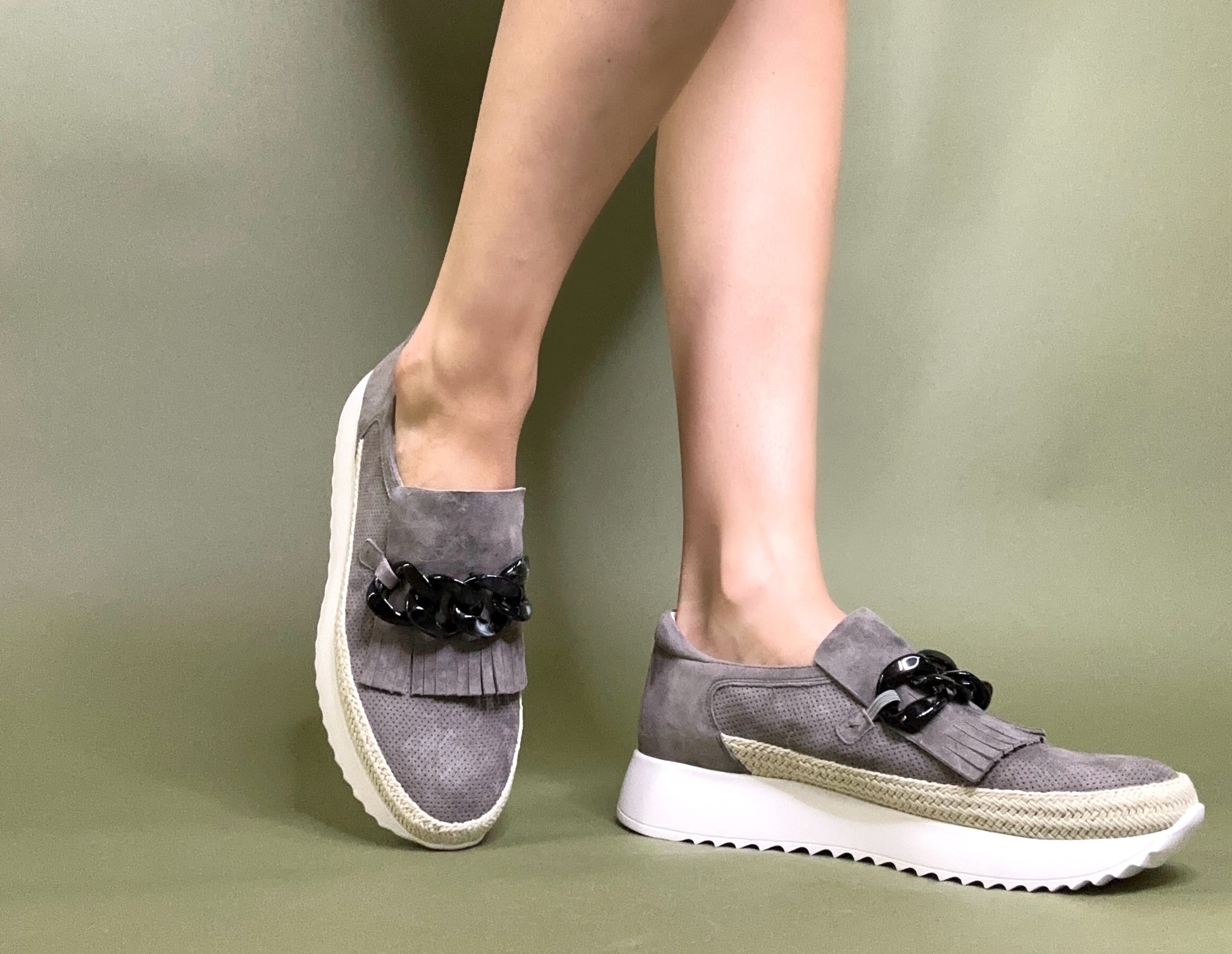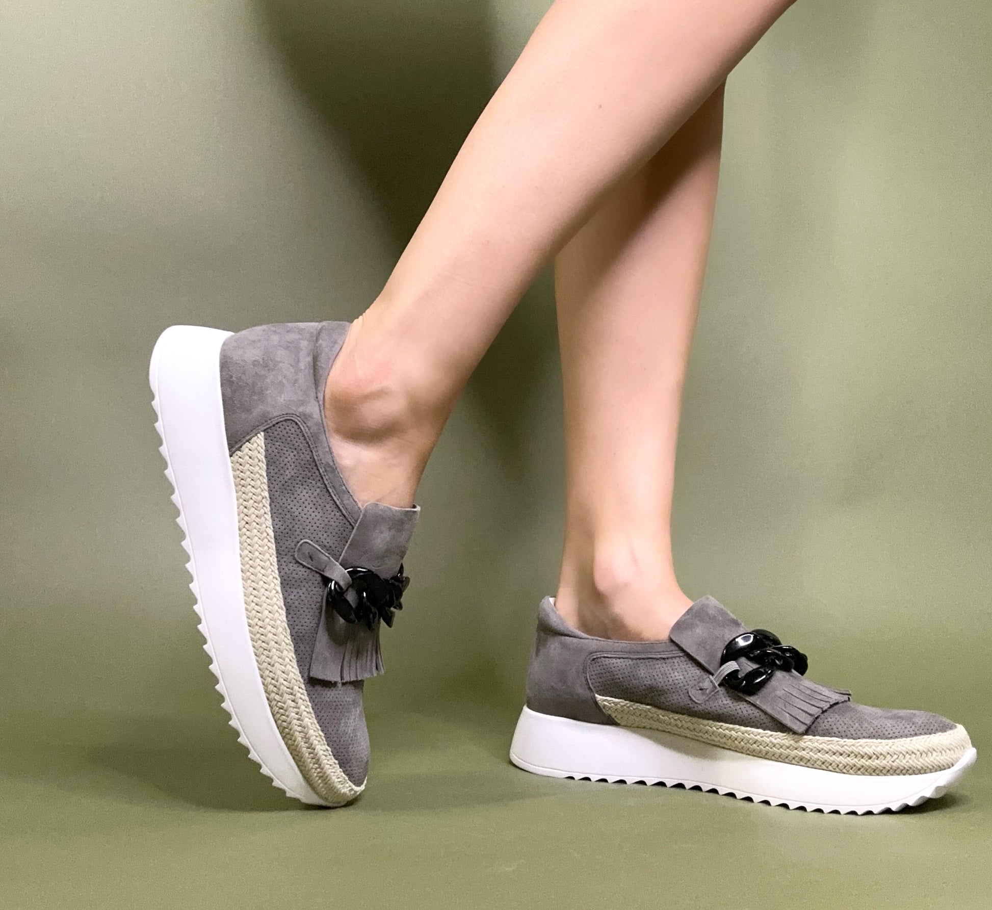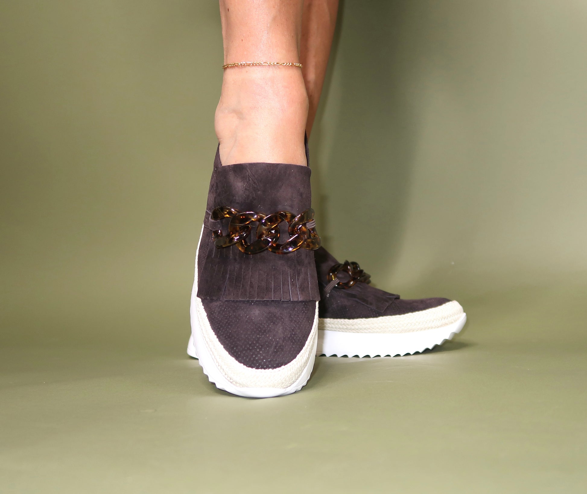 Chain-accent kiltie athleisure shoe. Braided rope trim. Perforated suede upper. Ultra-padded removable insole. 1.5 inches treaded rubber sole.