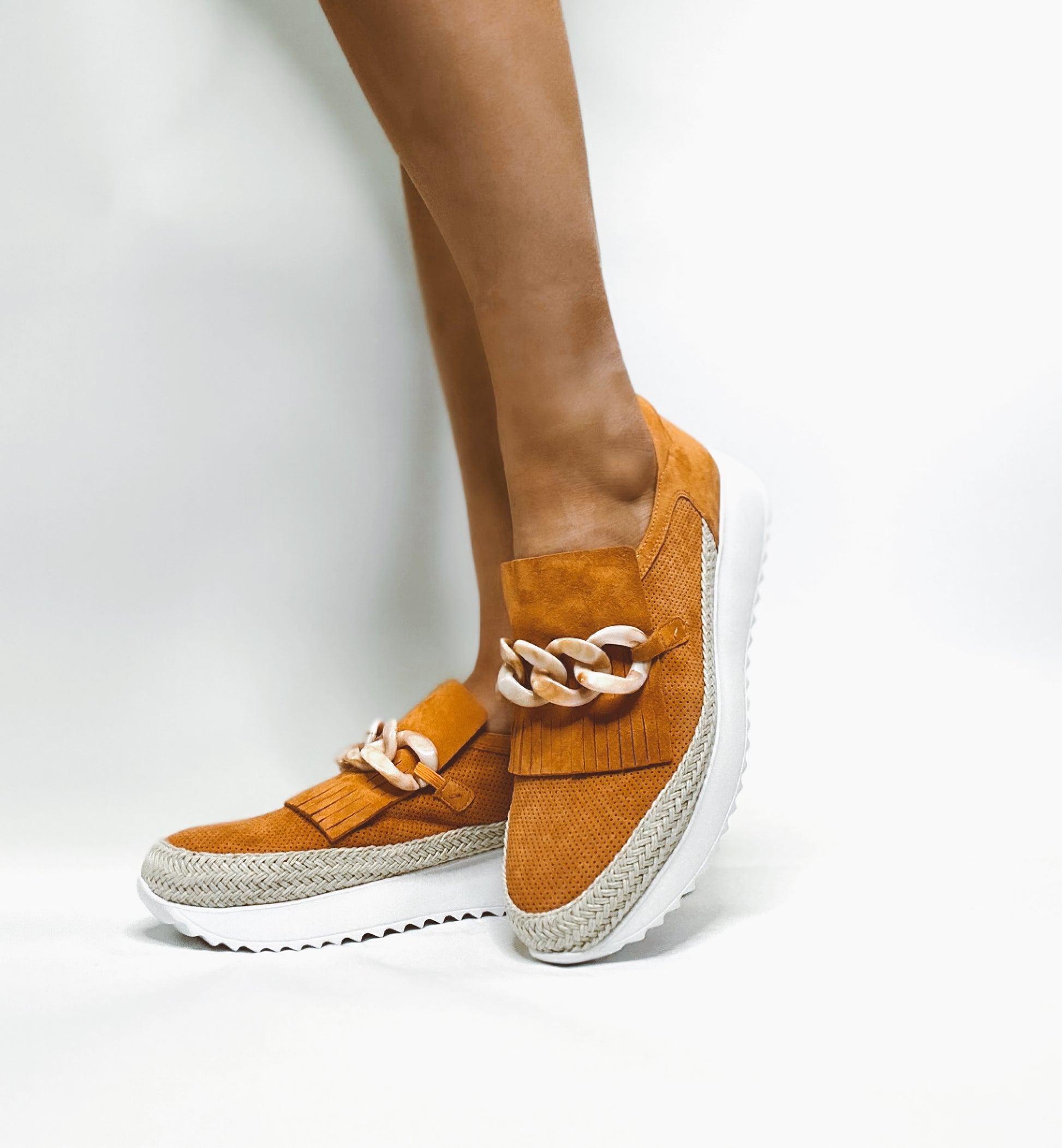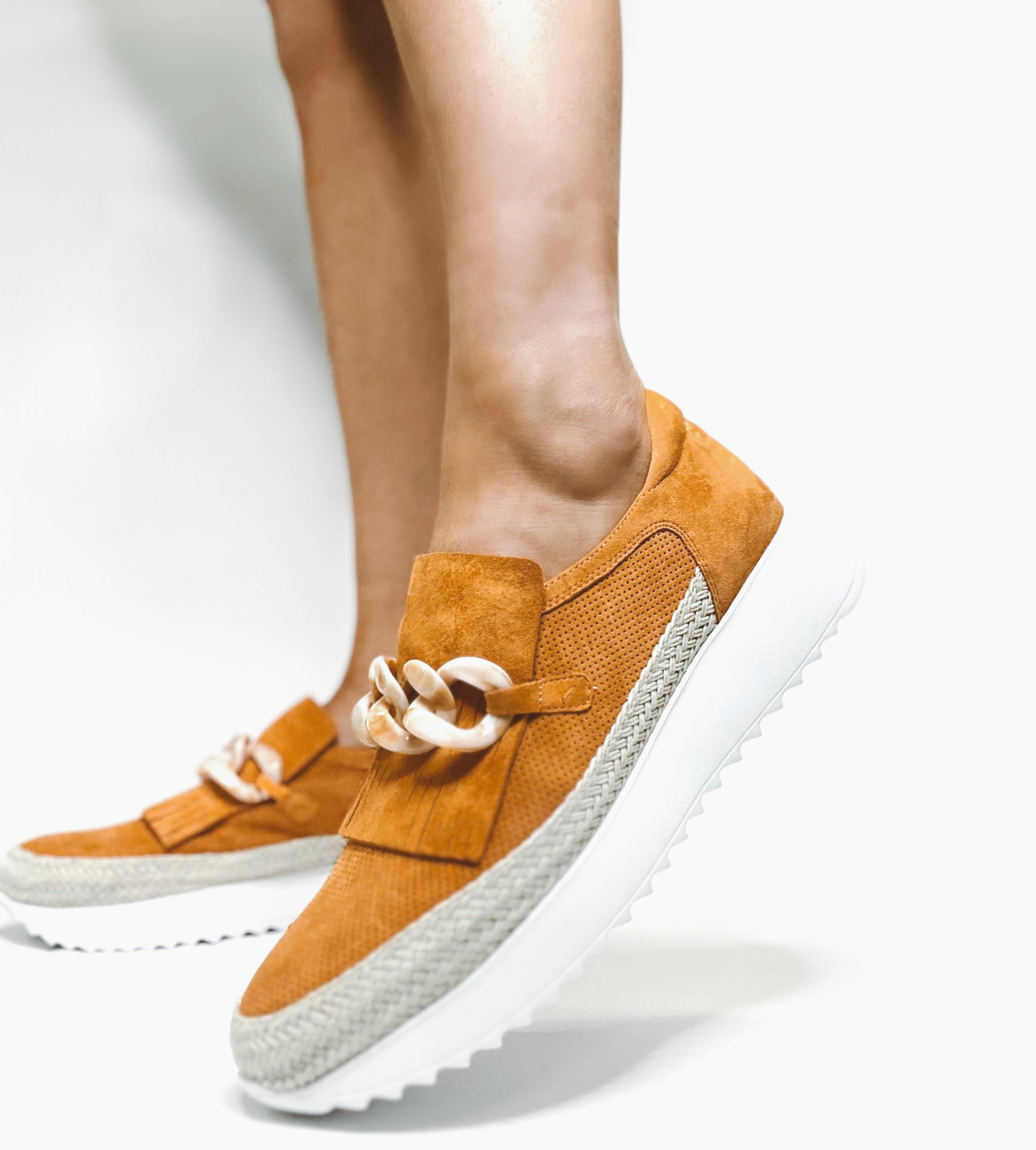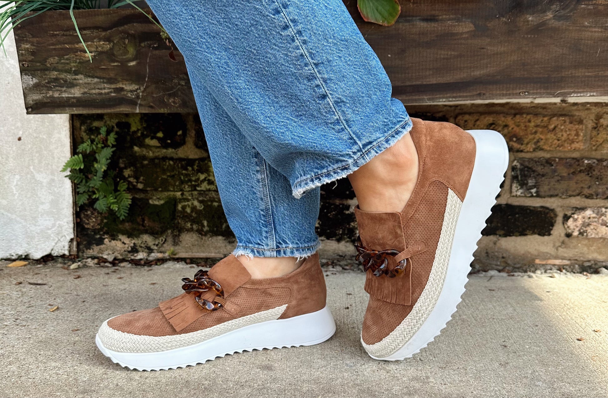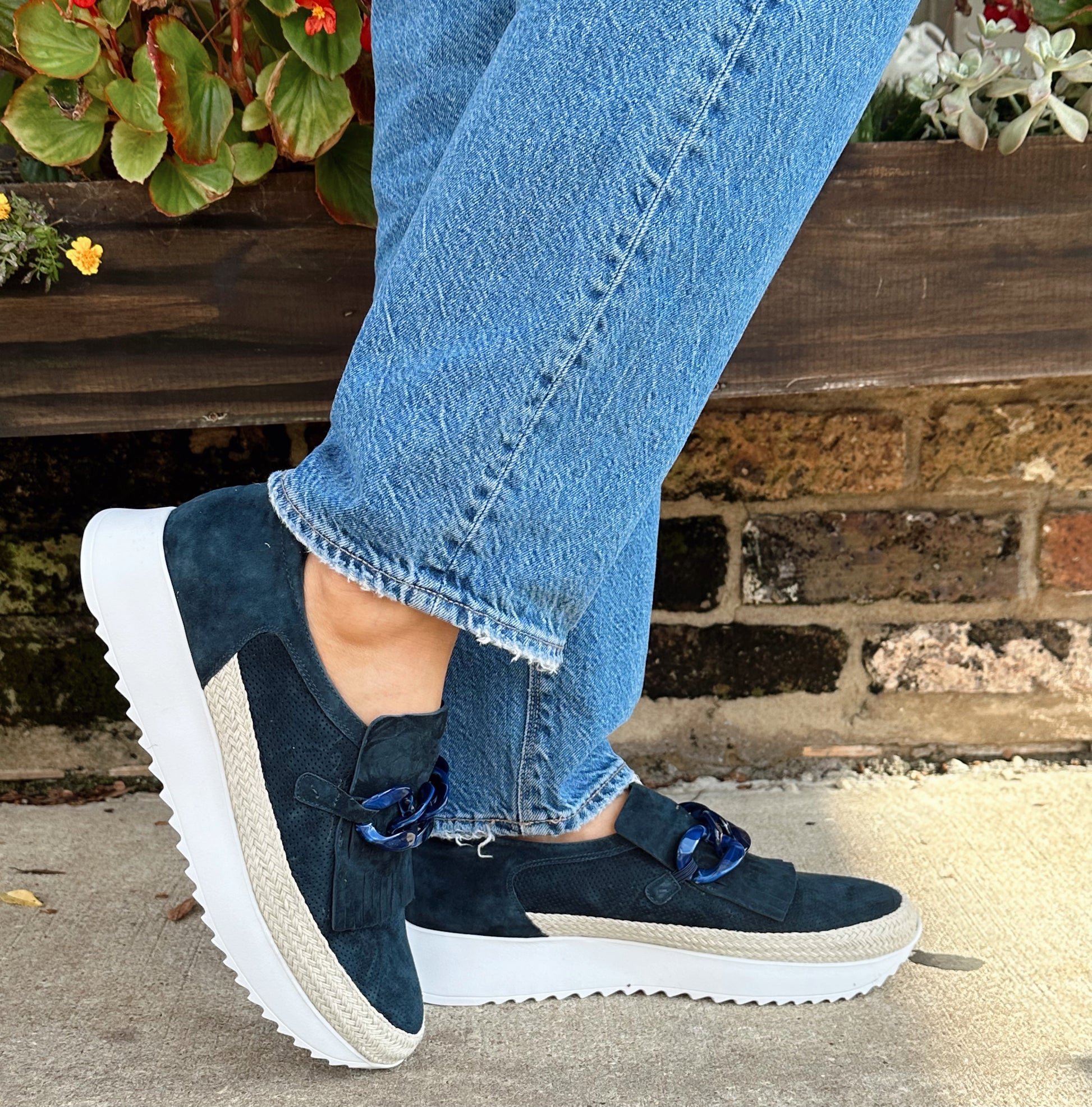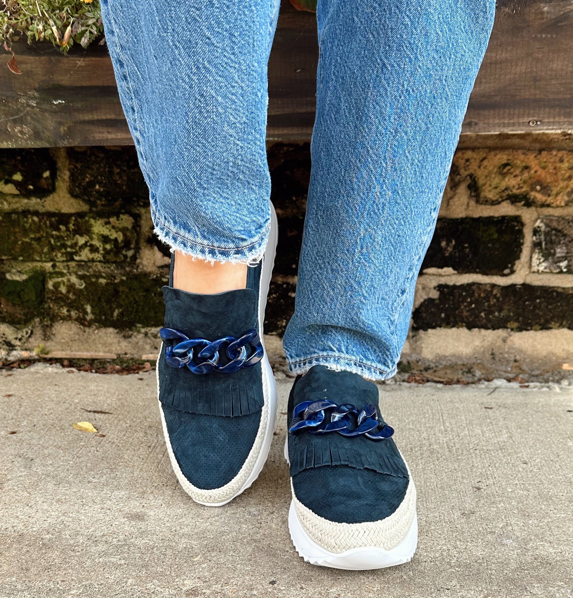 Chain-accent kiltie athleisure shoe. Braided rope trim. Perforated suede upper. Ultra-padded removable insole. 1.5 inches treaded rubber sole.