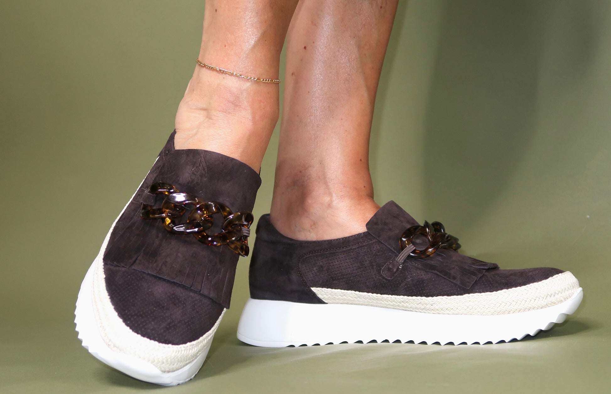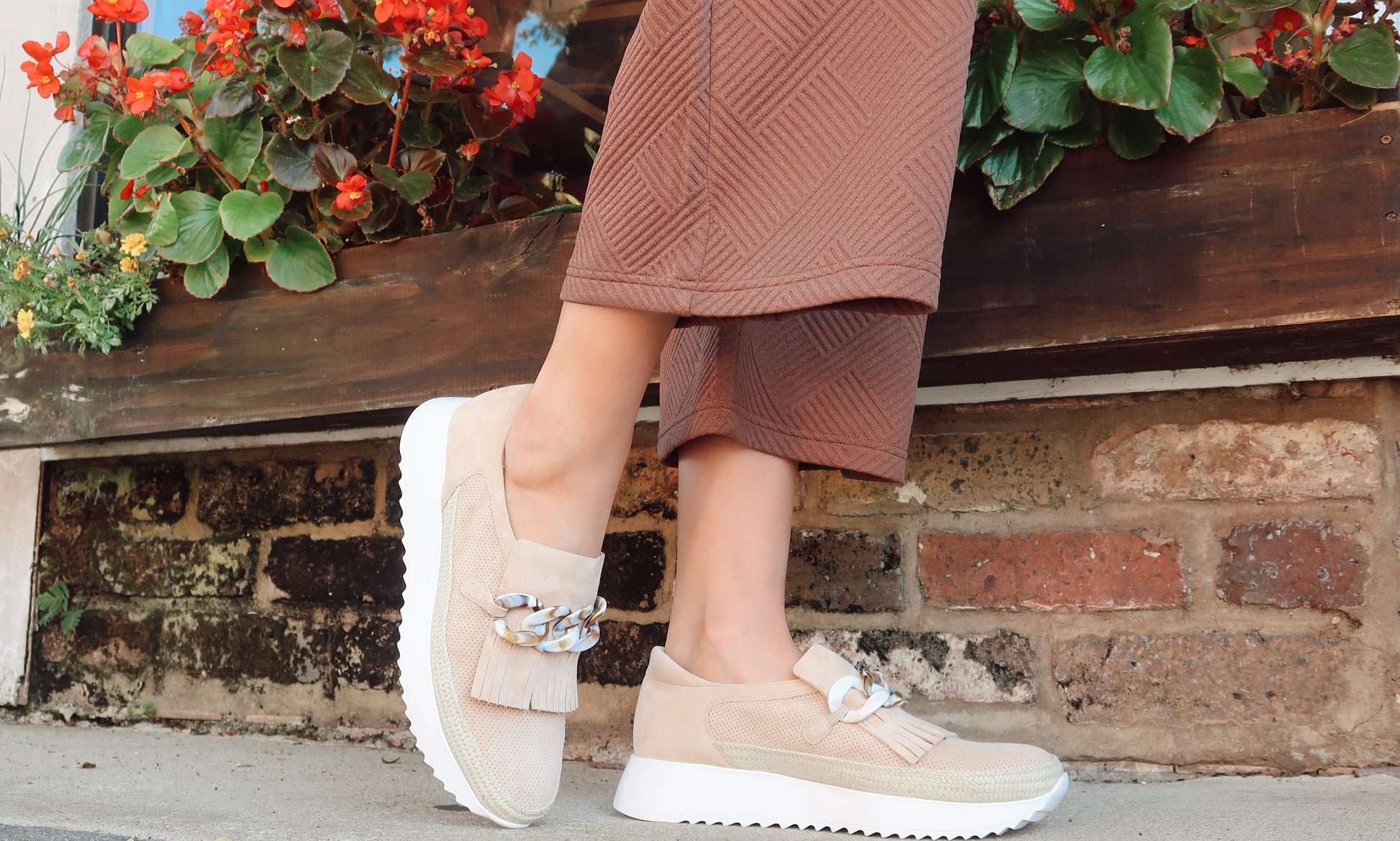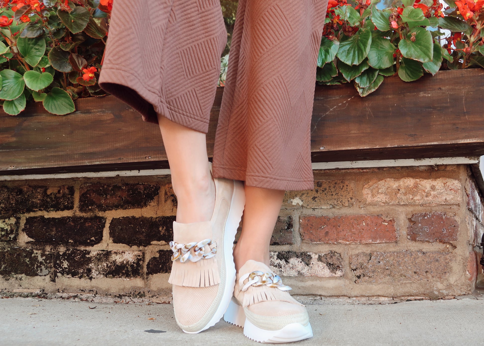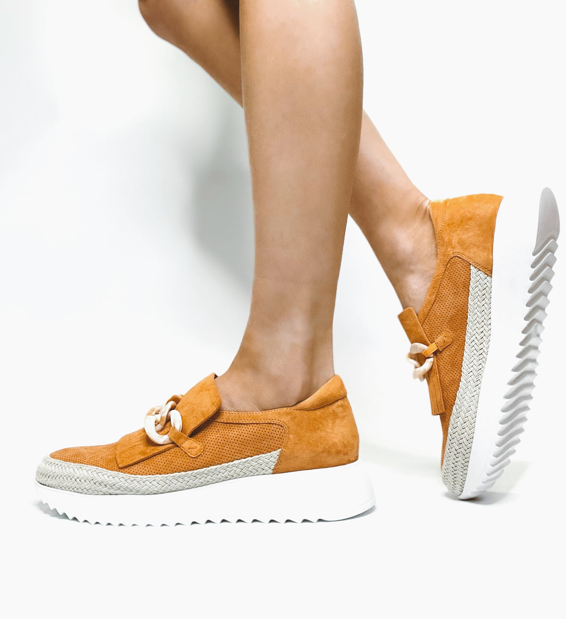 Chain-accent kiltie athleisure shoe. Braided rope trim. Perforated suede upper. Ultra-padded removable insole. 1.5 inches treaded rubber sole.