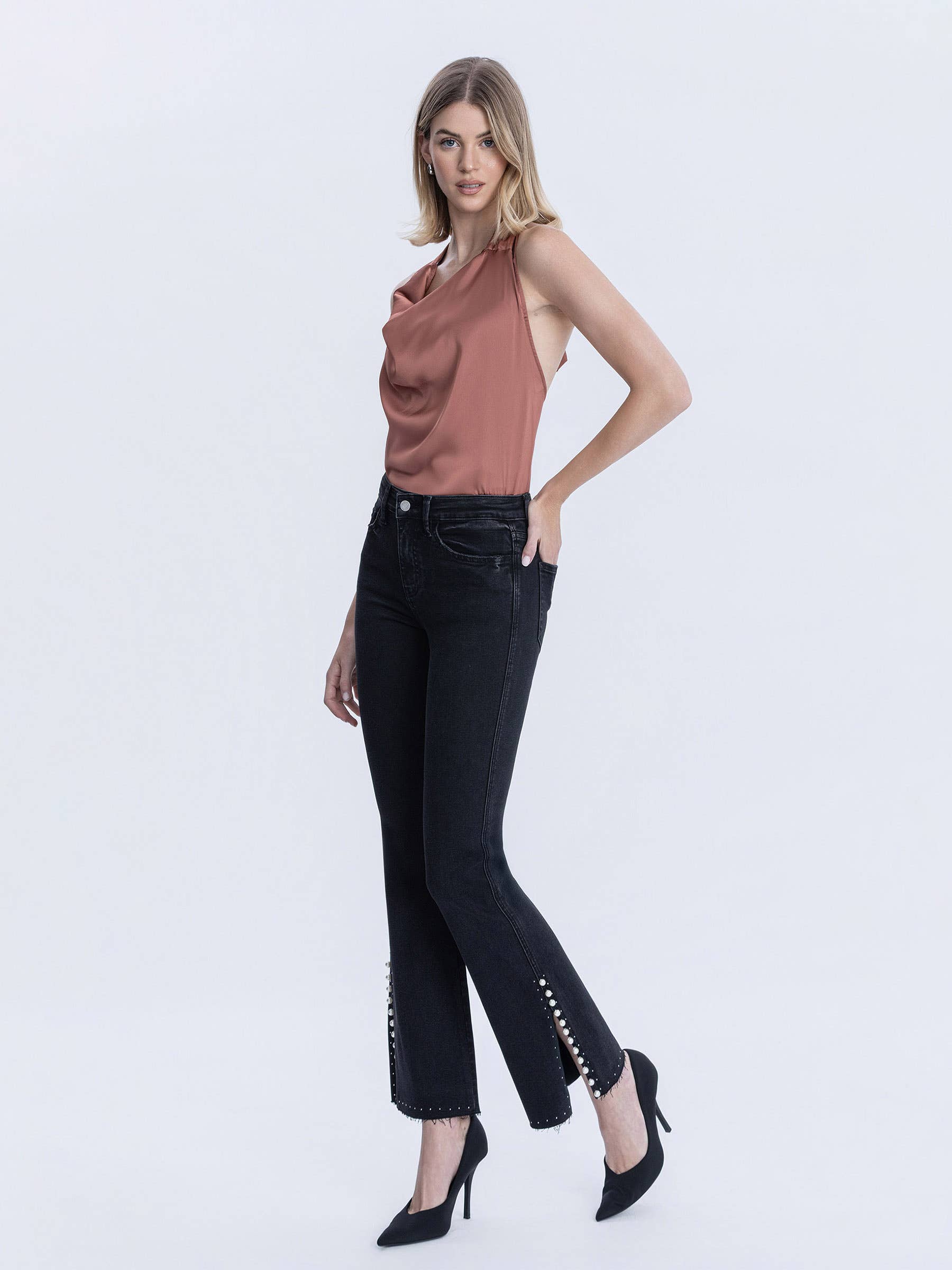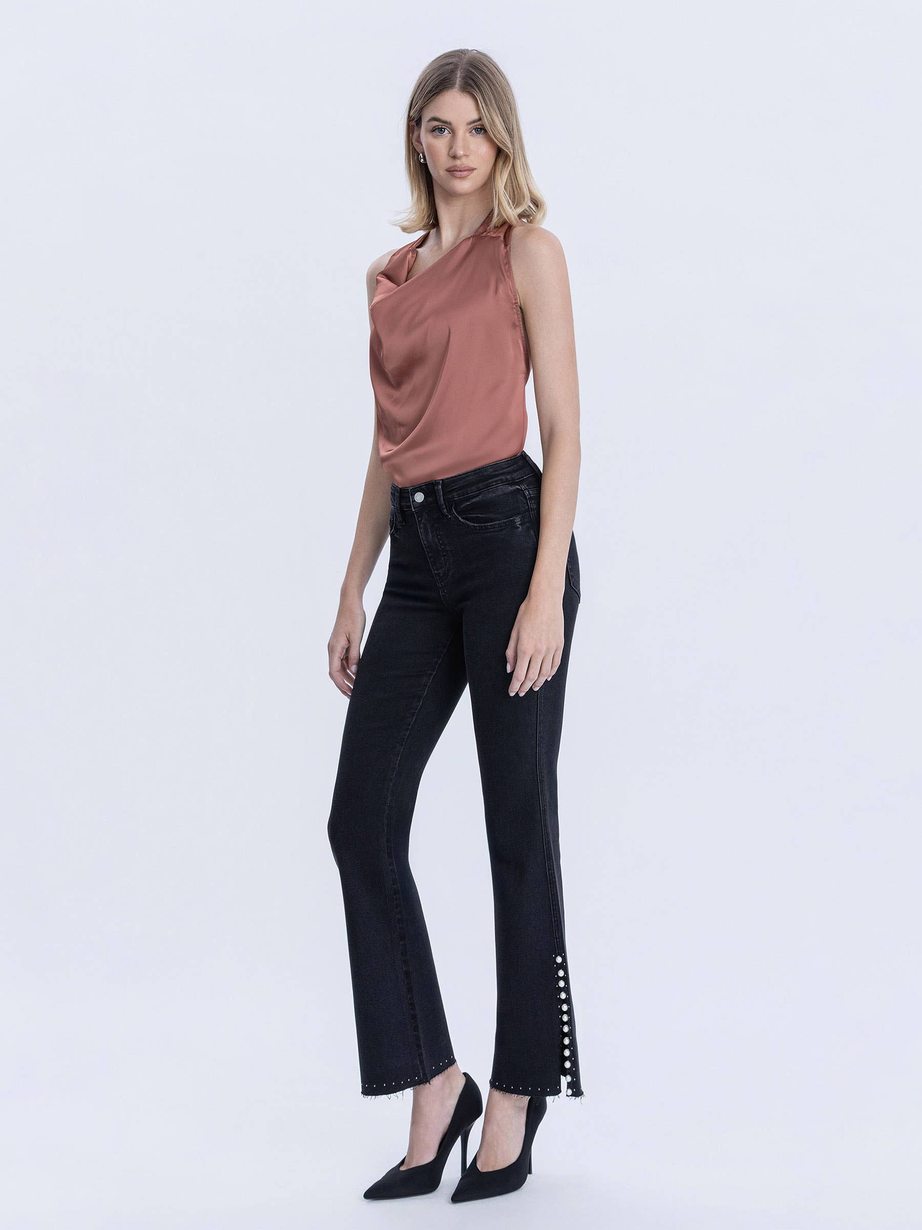COMFORT STRETCH DENIM, HIGH RISE WAIST, 5 POCKETS, BOTTOM SIDE AND HEM PEARL EMBELLISHMENT, SLIT HEM, FULL LENGTH, BLACK BOOTCUT JEANS