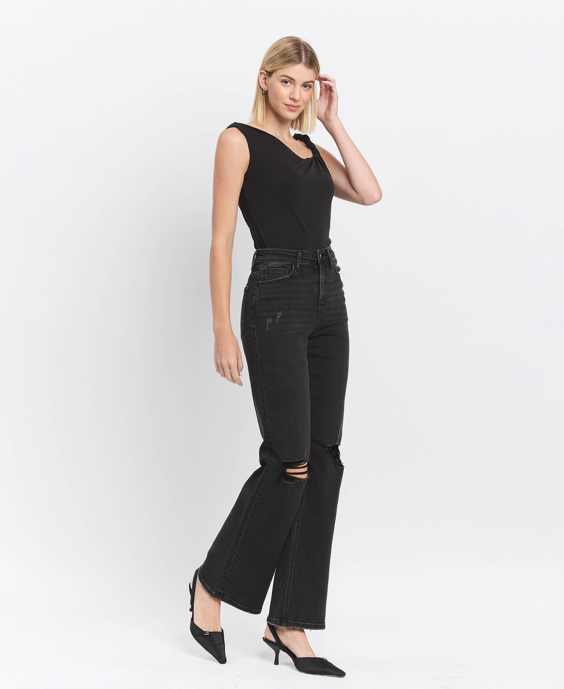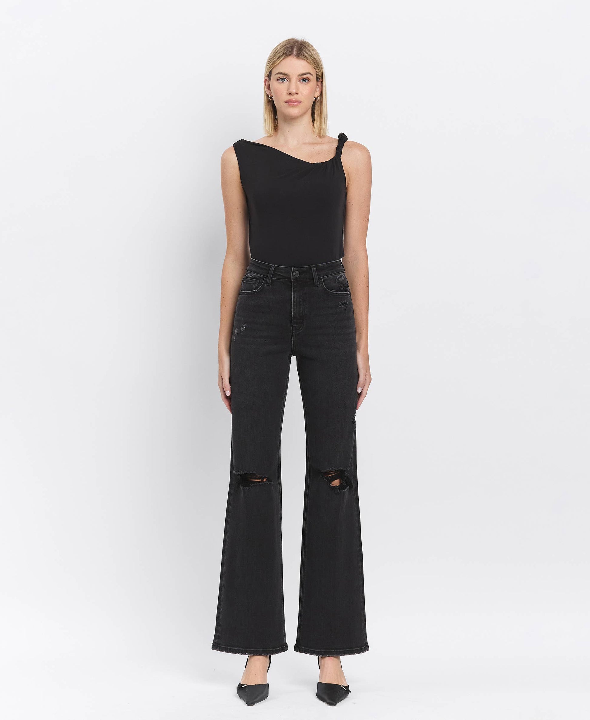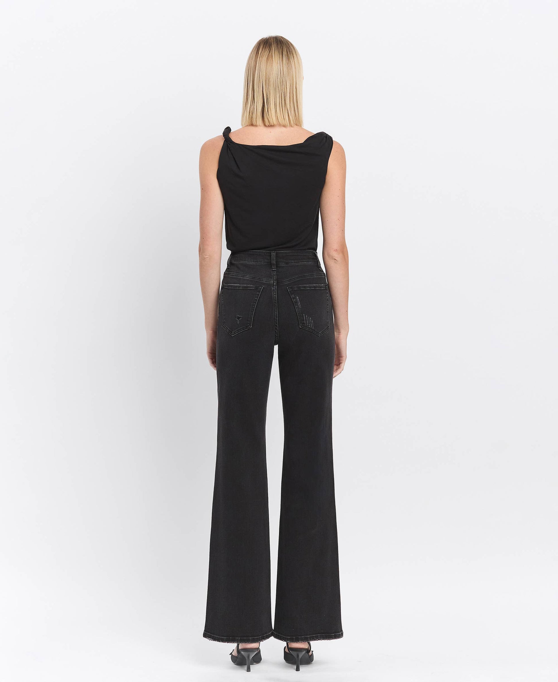 COMFORT STRETCH DENIM, SUPER HIGH RISE WAIST, 90'S VINTAGE STYLE, DISTRESSED DETAIL, FINISHED HEM, FULL LENGTH, FLARE JEANS