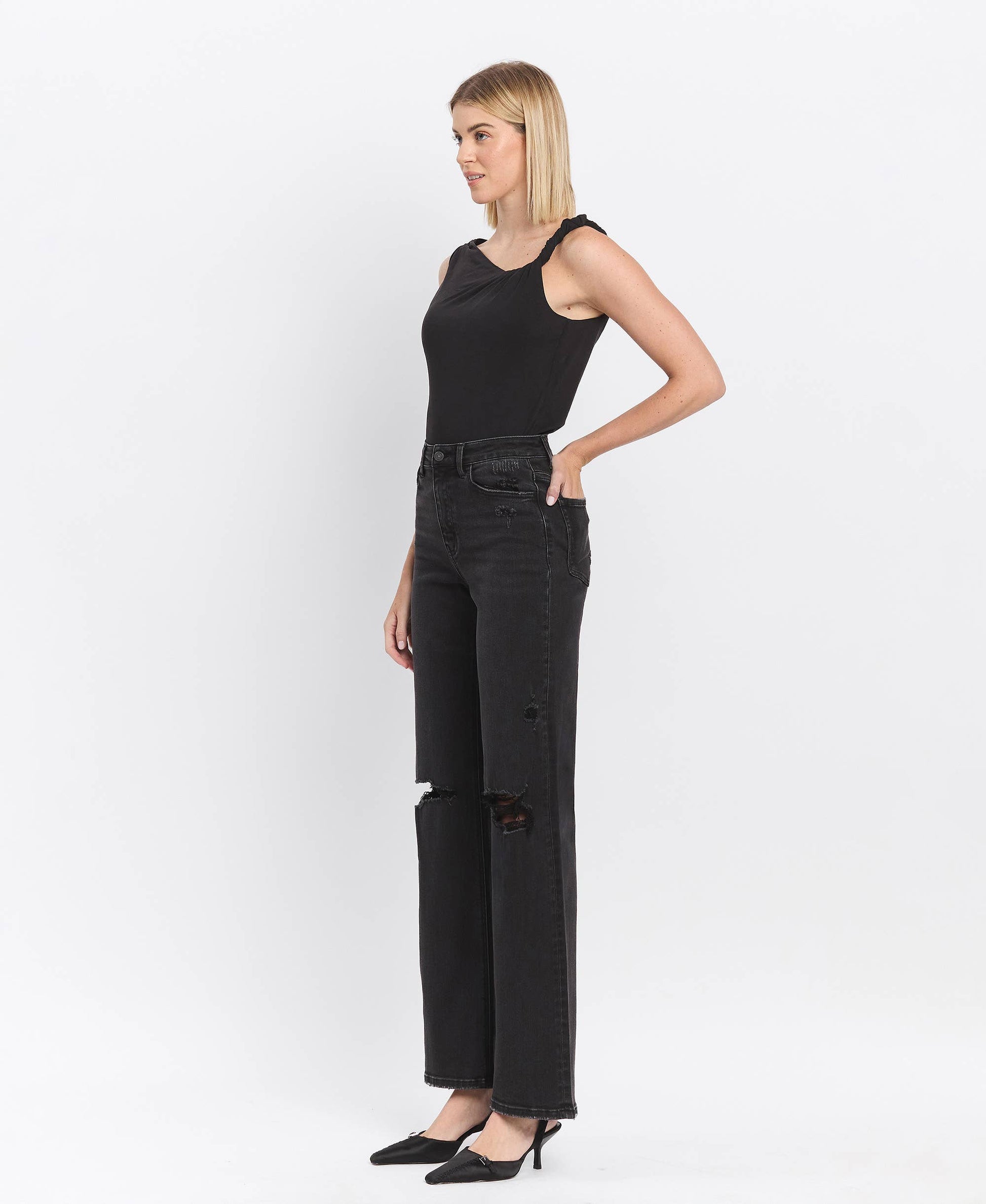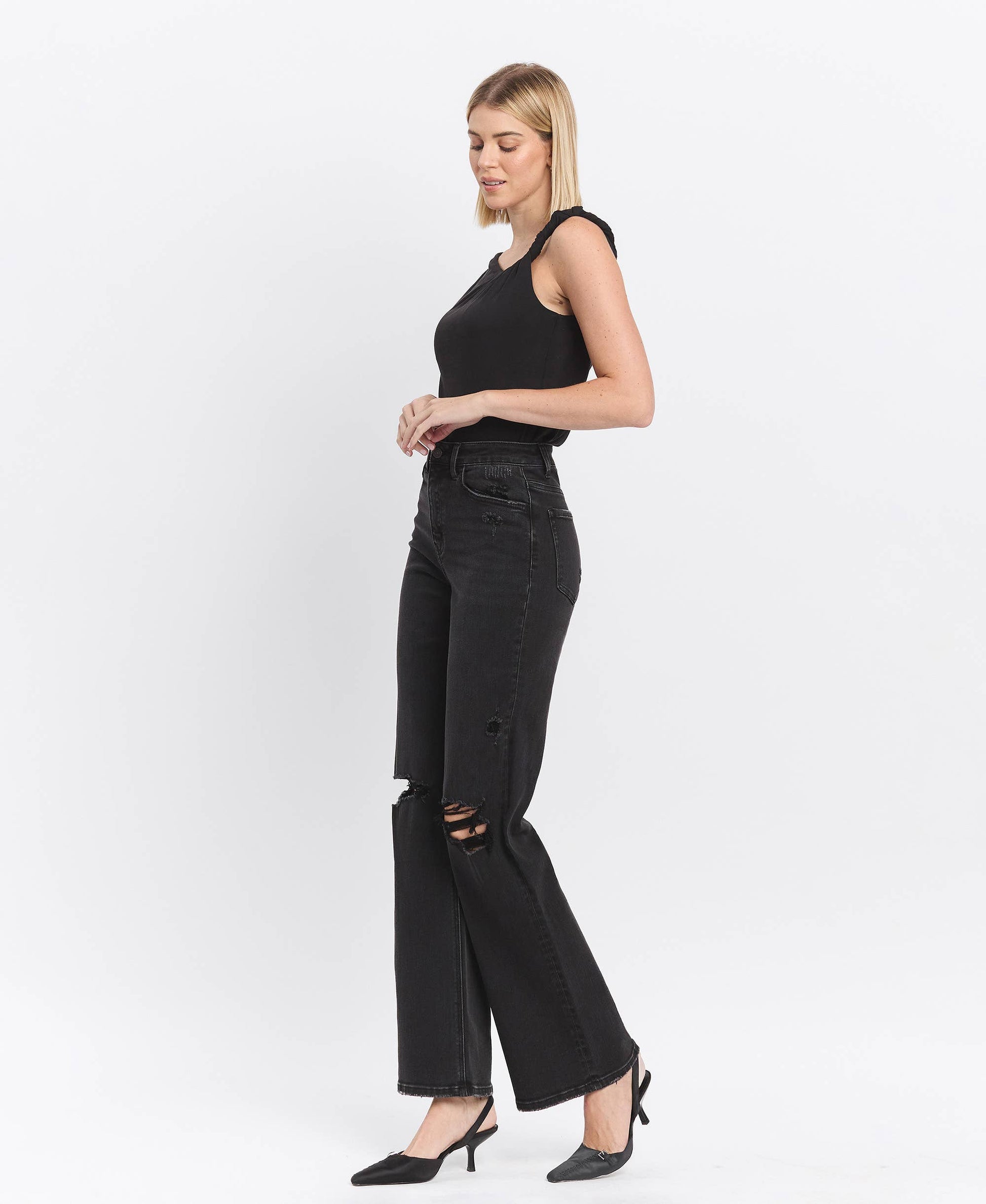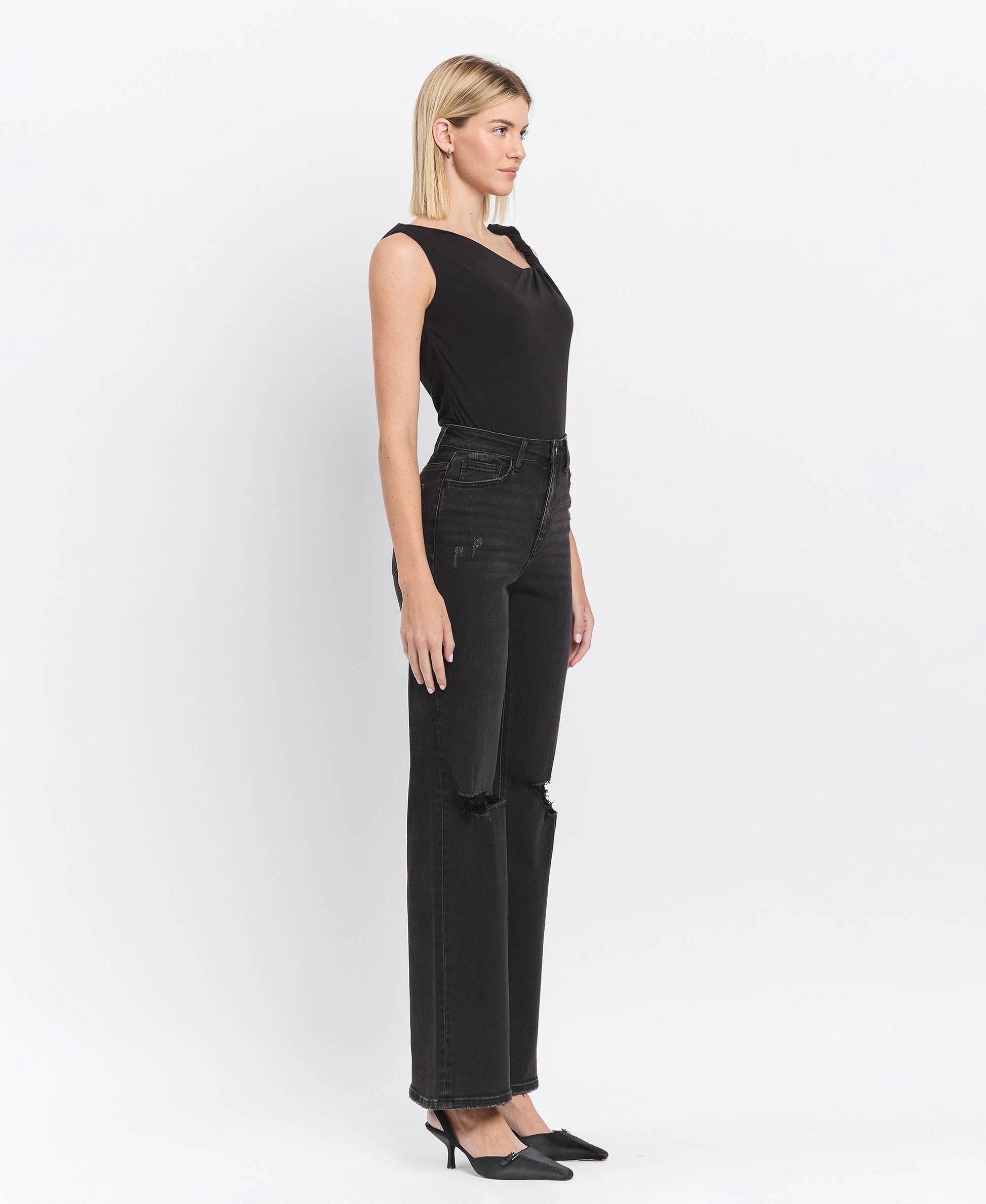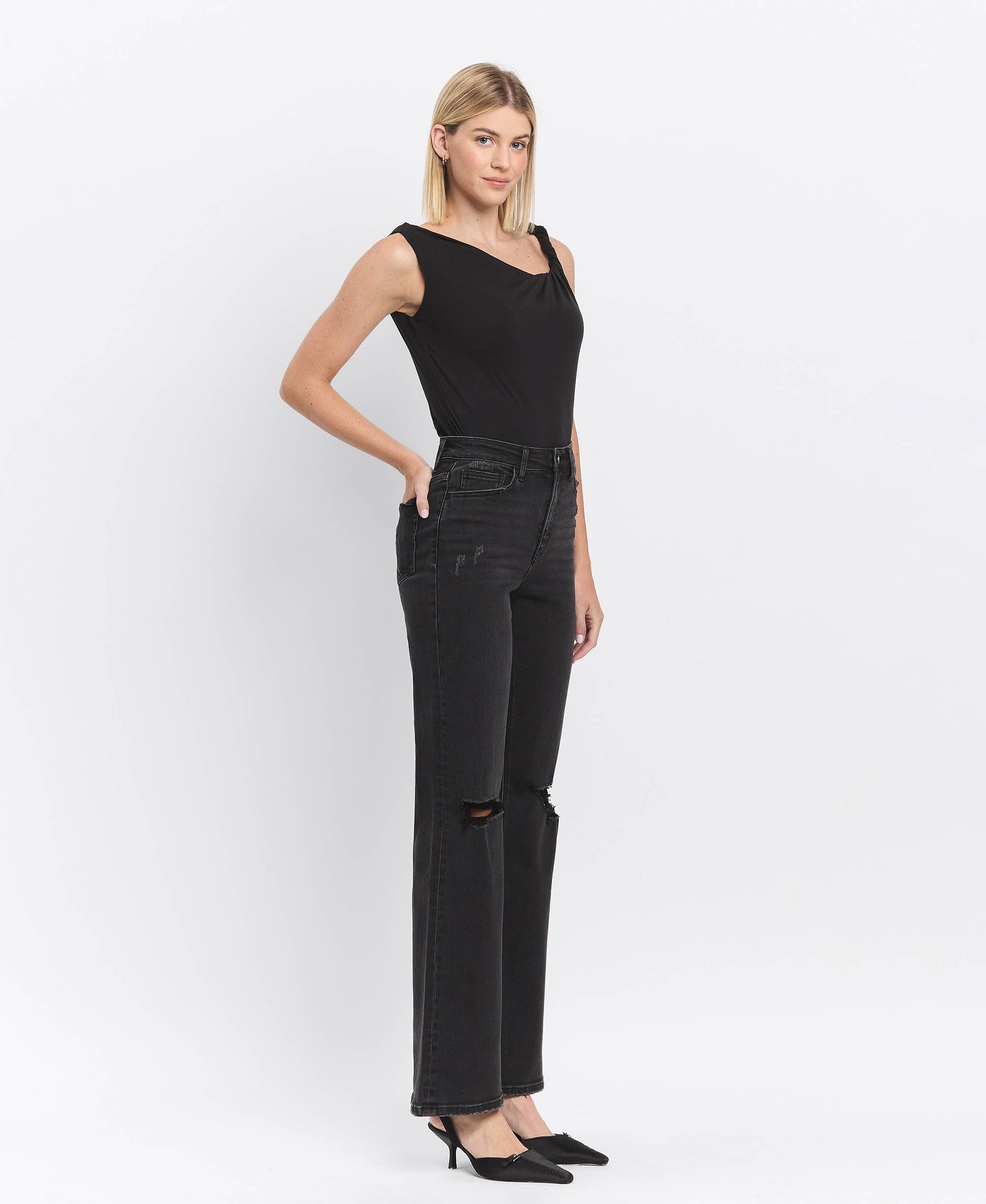 COMFORT STRETCH DENIM, SUPER HIGH RISE WAIST, 90'S VINTAGE STYLE, DISTRESSED DETAIL, FINISHED HEM, FULL LENGTH, FLARE JEANS