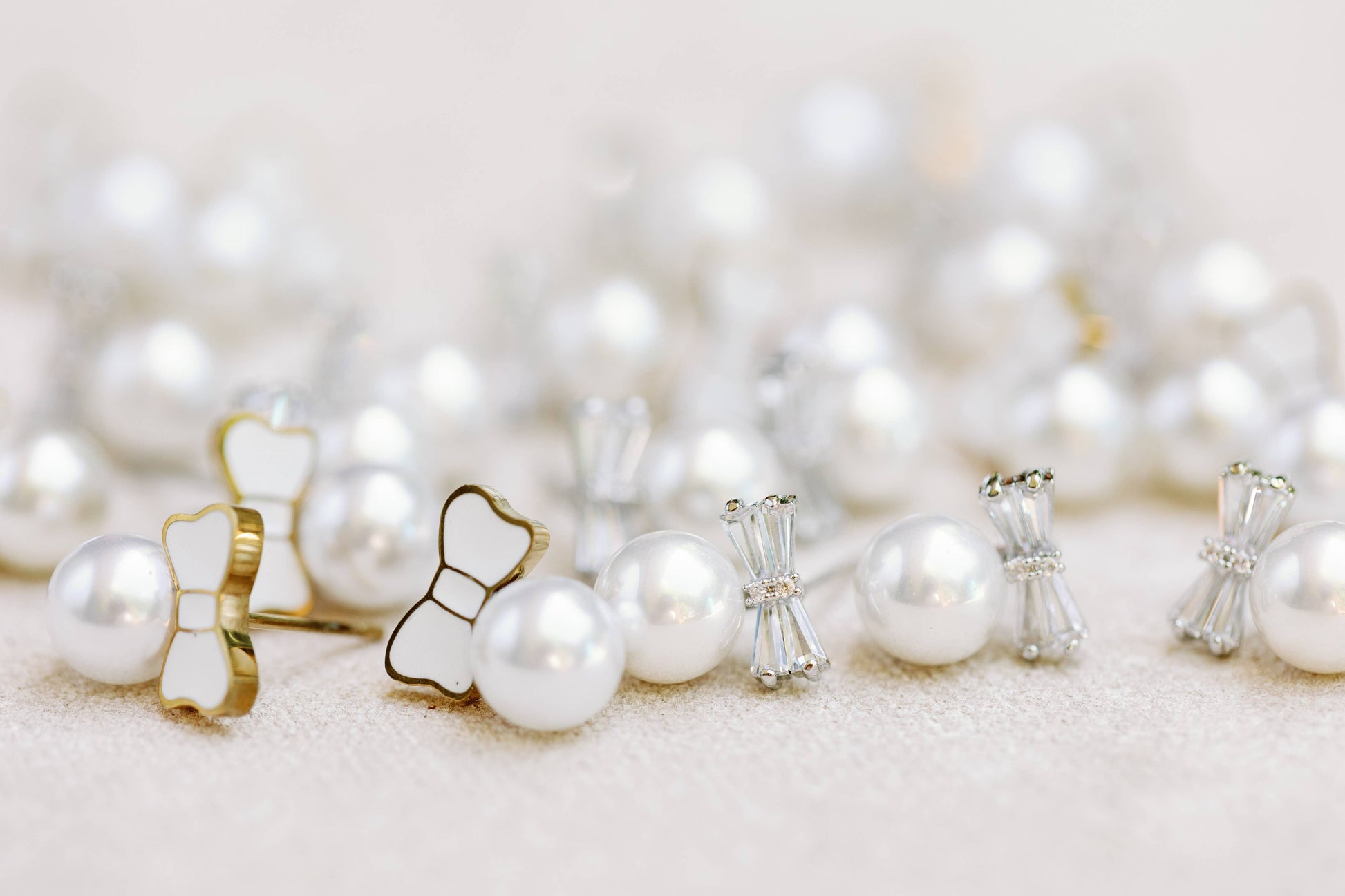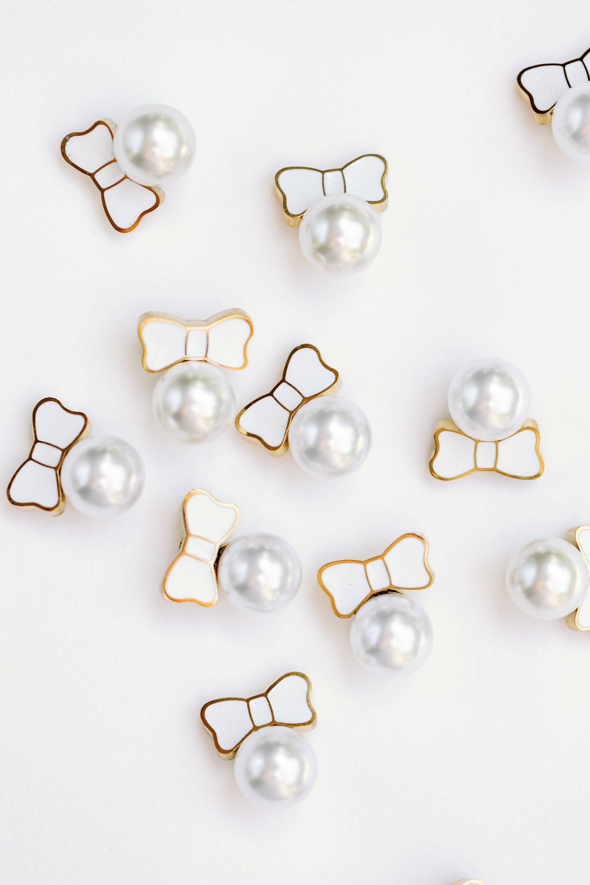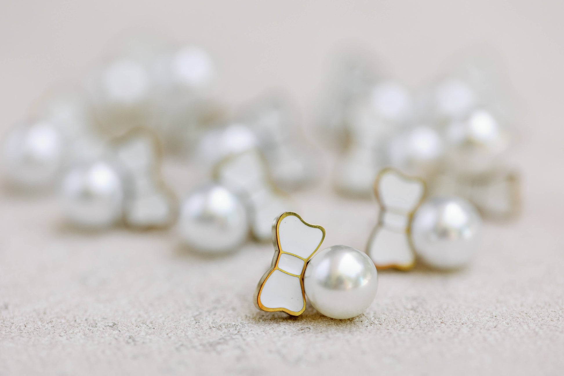 Add a playful touch to your look with our newest “tuxedo” pearl earrings! These mini studs feature a lustrous mini 8mm faux pearl topped with a fun white fun white enamel ‘tuxedo’ style bow. These make a perfect ‘grab and go’ gift for the holidays!